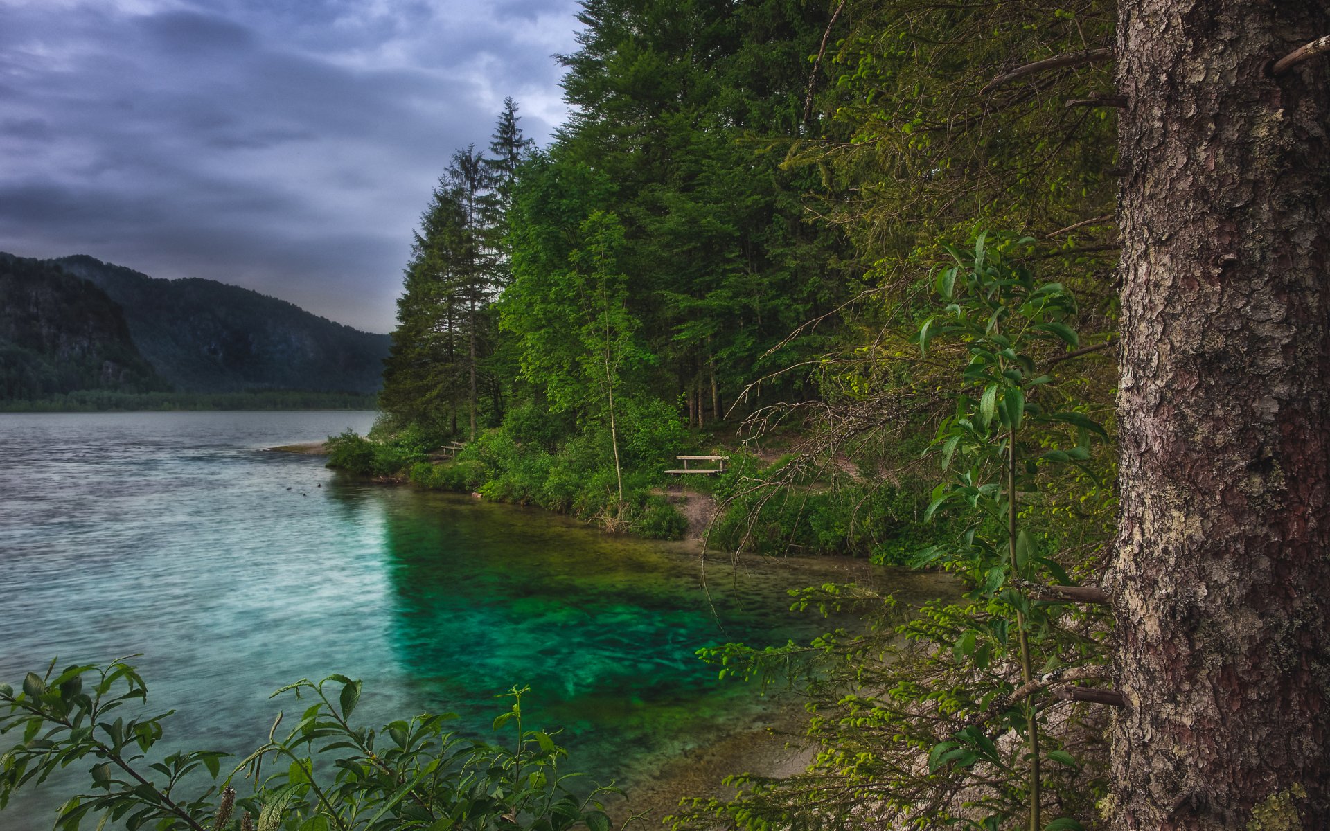 Tags:ciel, nuages, montagnes, lac, arbres, forêt
