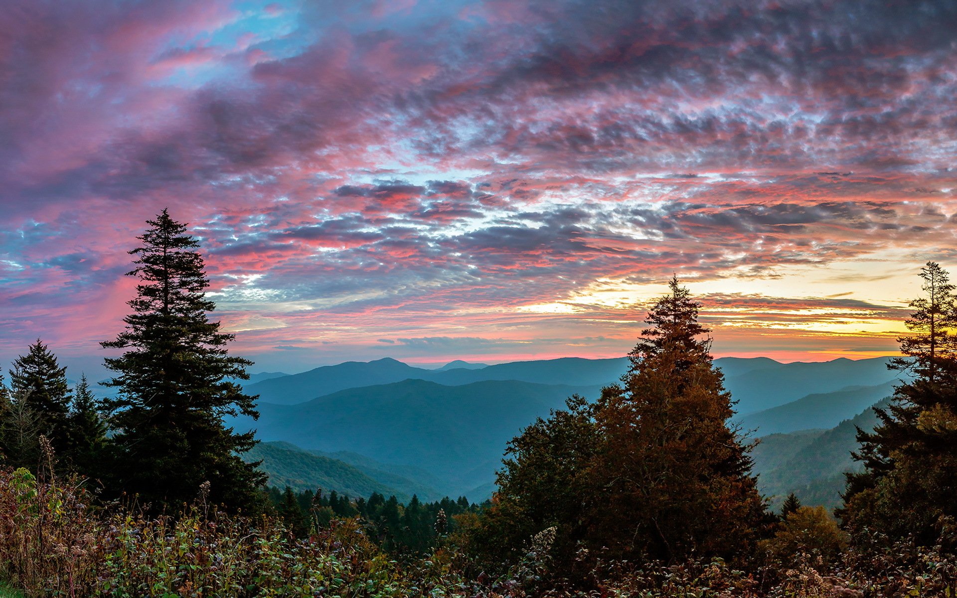 Paysage de montagne de forêt au coucher du soleil - fond d'écran de bureau