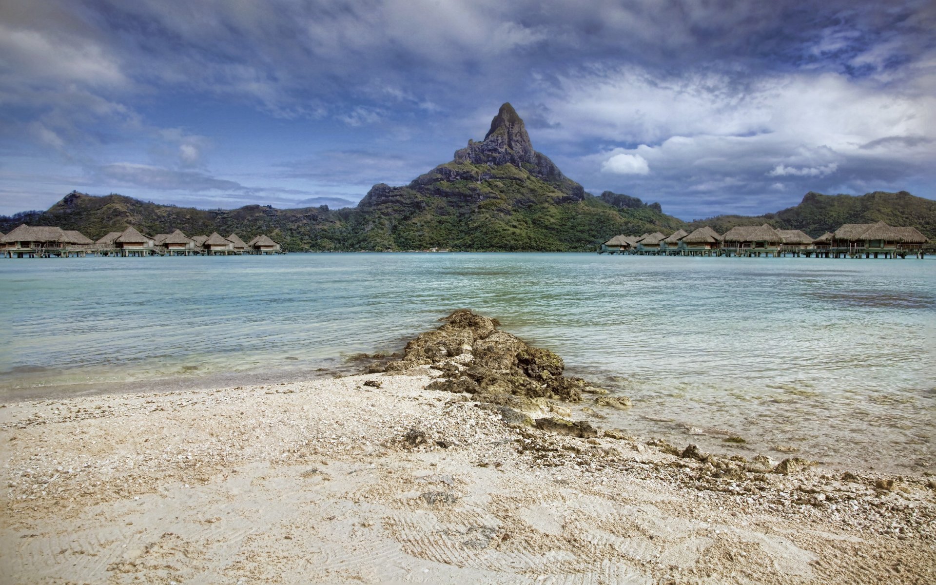 Plage de sable près des huttes de chaume - fond d'écran de bureau