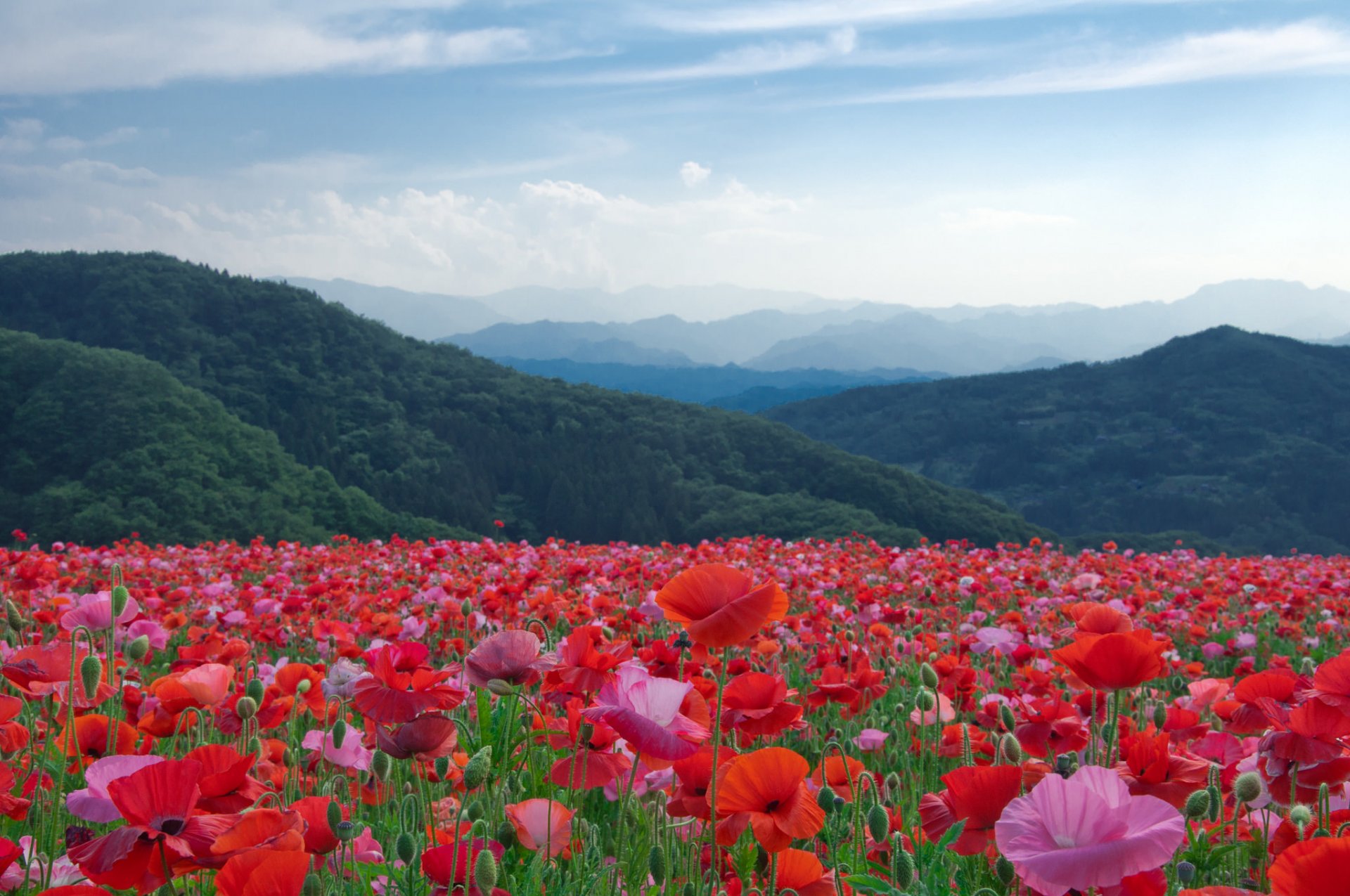 Tags:nature, paysage, montagnes, arbres, pré, fleurs, coquelicots
