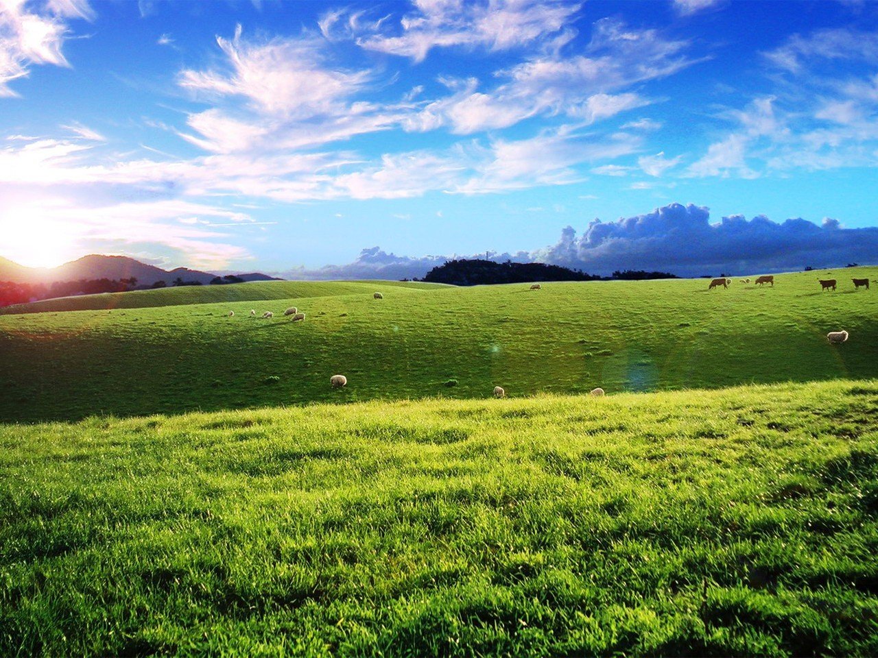 Prairie verte et troupeau de moutons - fond d'écran de bureau
