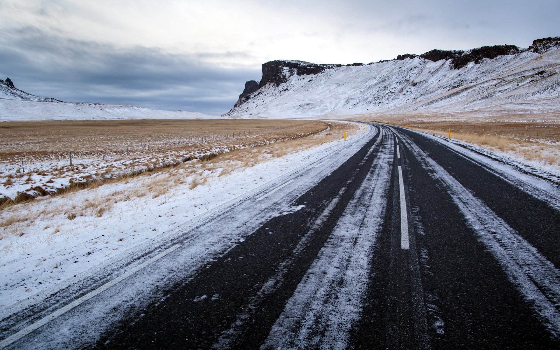 Route d hiver vers les montagnes sombres - fond d'écran de bureau