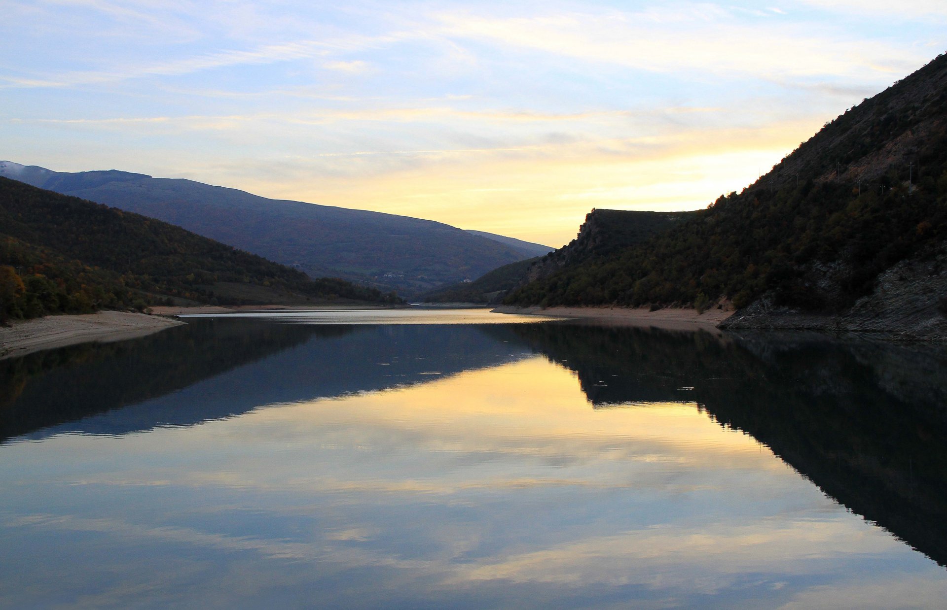 Le ciel et les montagnes se reflètent dans le lac - fond d'écran de bureau