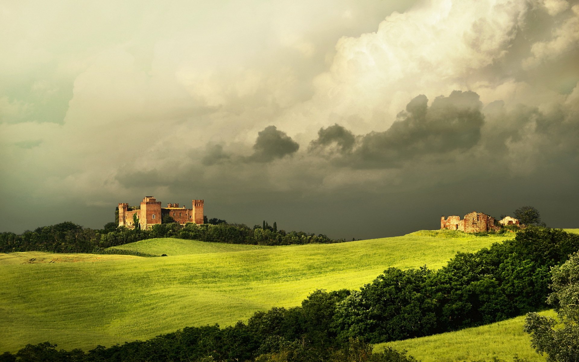 Toscane dans les nuages et l herbe verte - fond d'écran de bureau