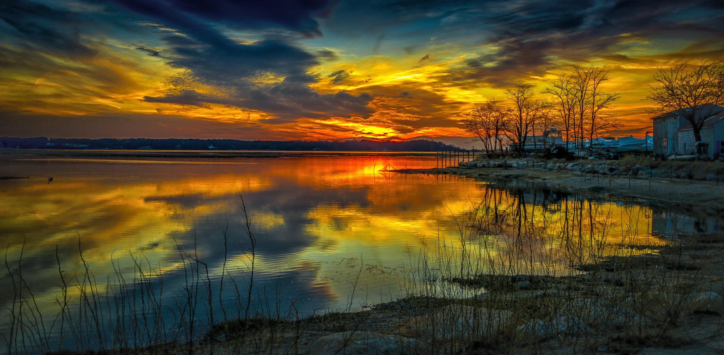 Tags:ciel, nuages, coucher de soleil, lueur, soirée, lac, maison, arbres