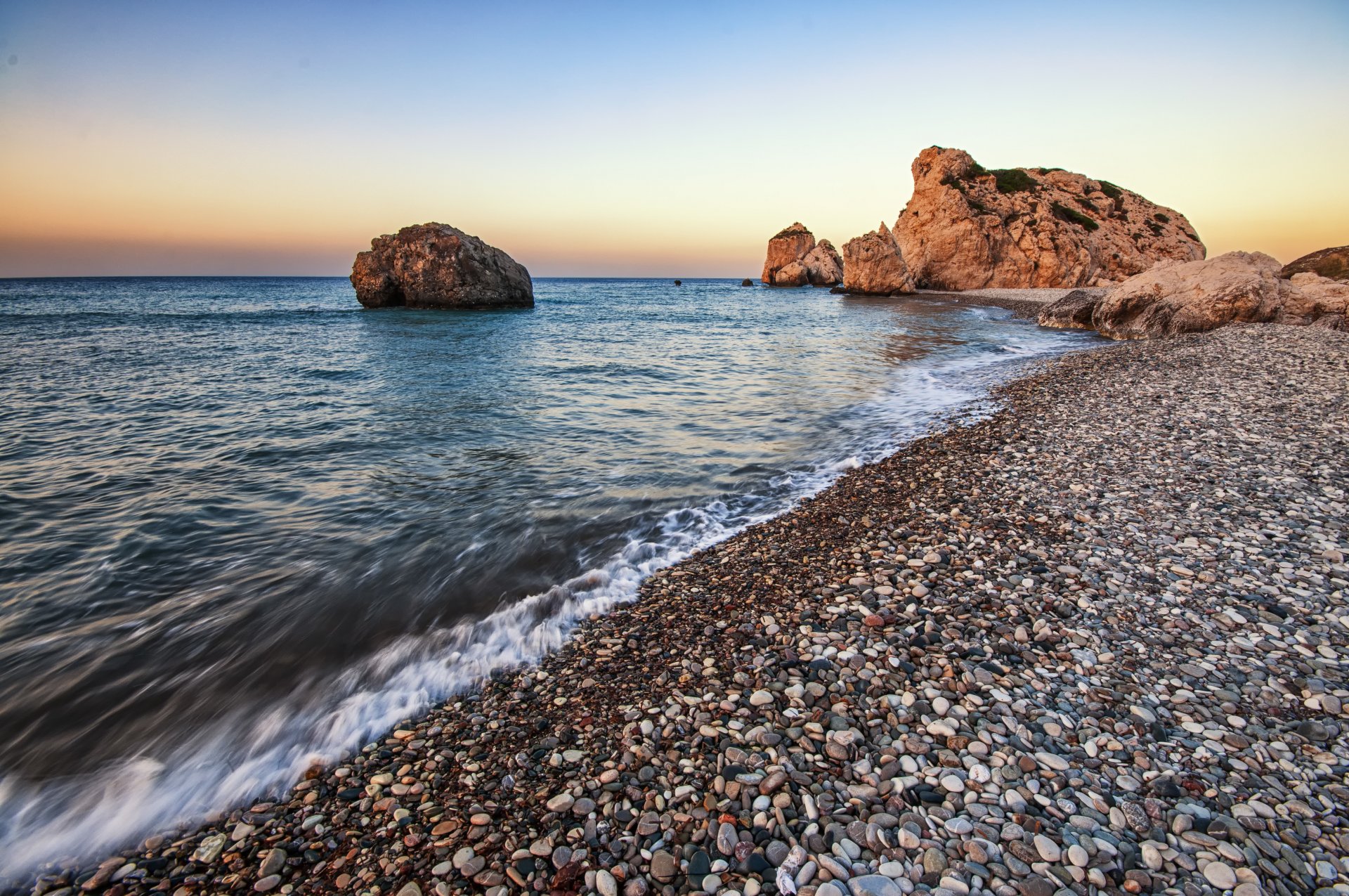 Tags:paysage, mer, cailloux, plage, rochers, coucher de soleil