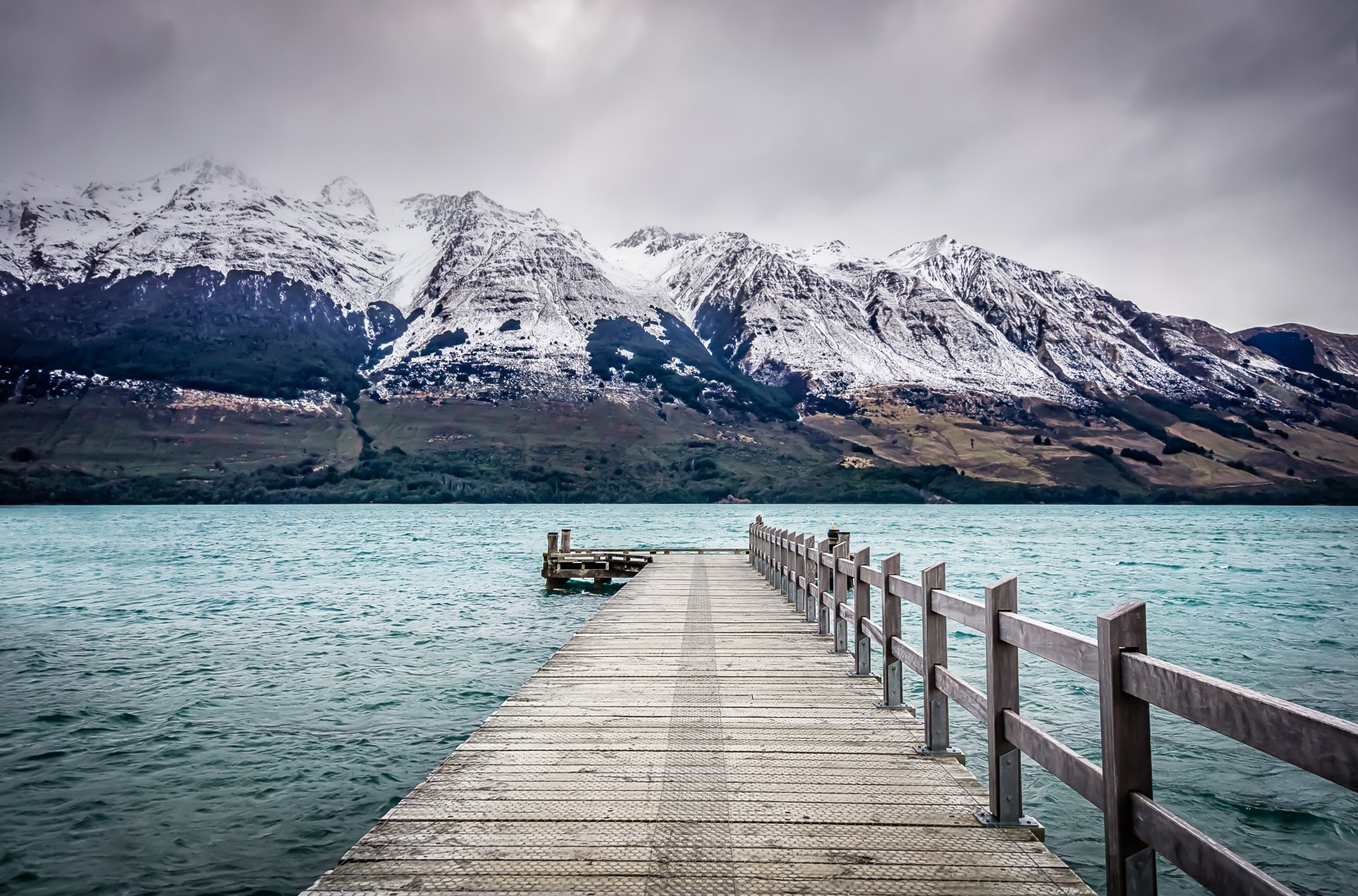 Tags:nouvelle-zélande, glenorchy, lac, quai, montagnes, jetée, nuages gris, orage