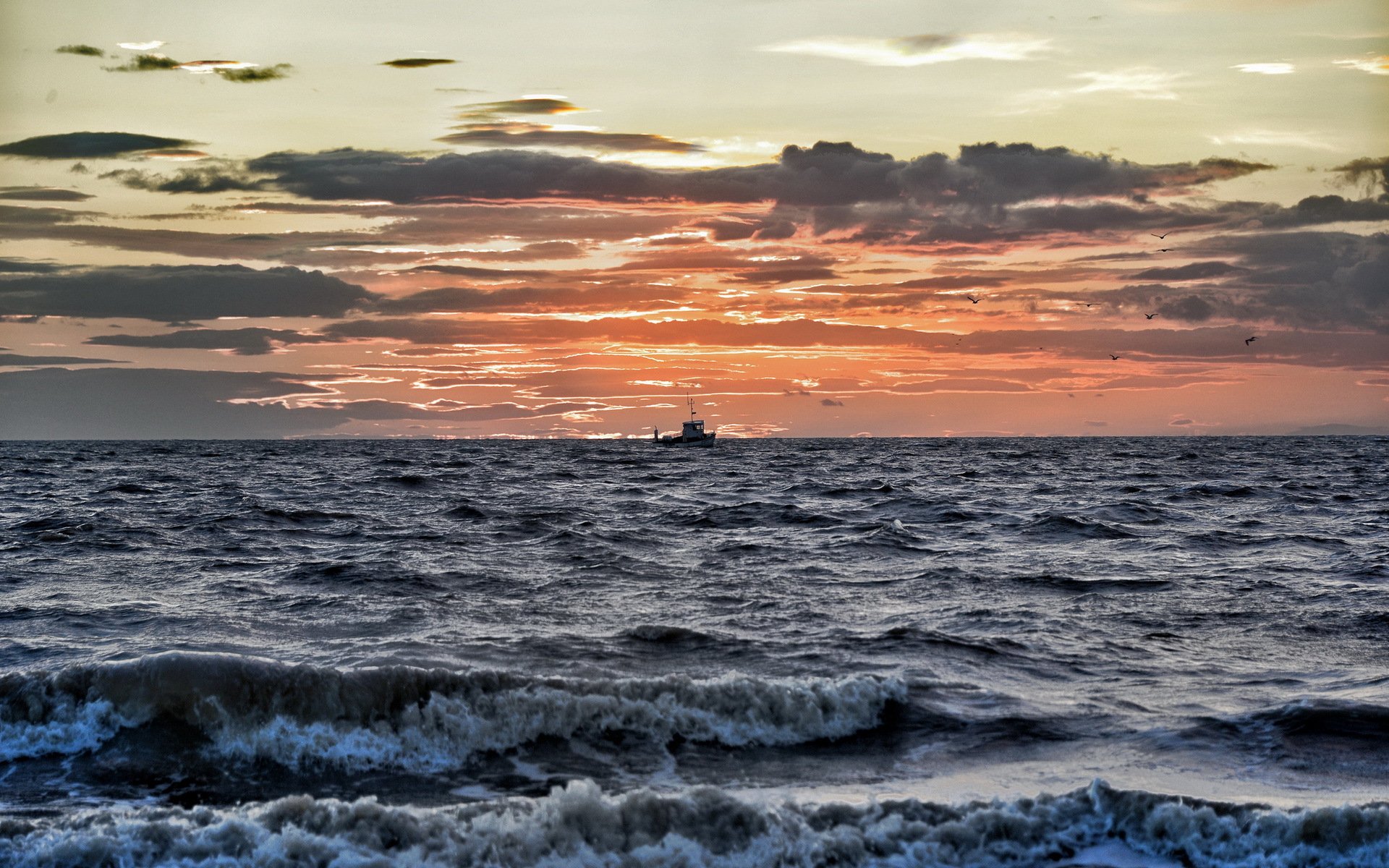 Navire sur fond de coucher de soleil dans la mer qui fait rage - fond d'écran de téléphone