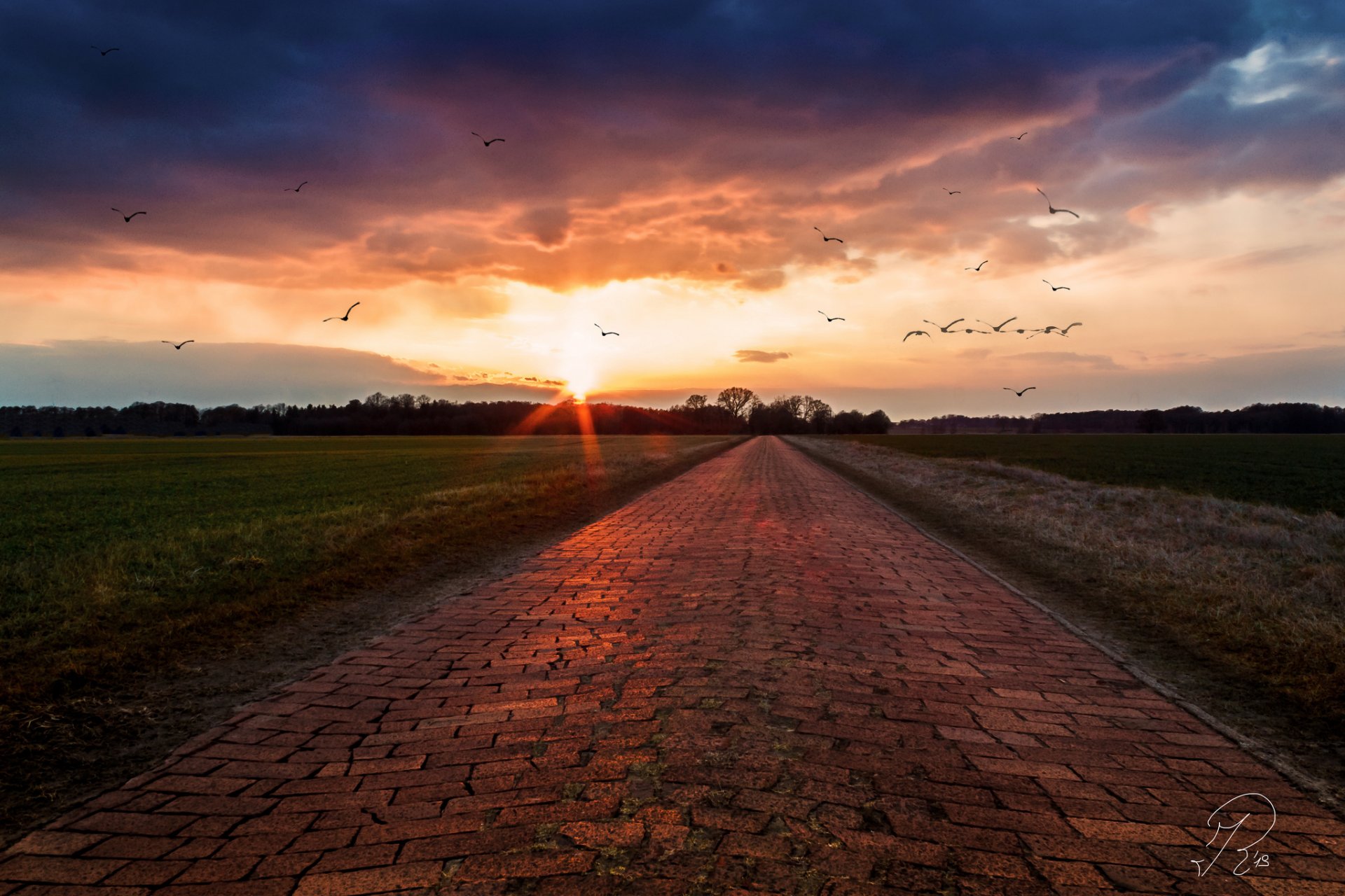 Tags:champs, route, oiseaux, aube