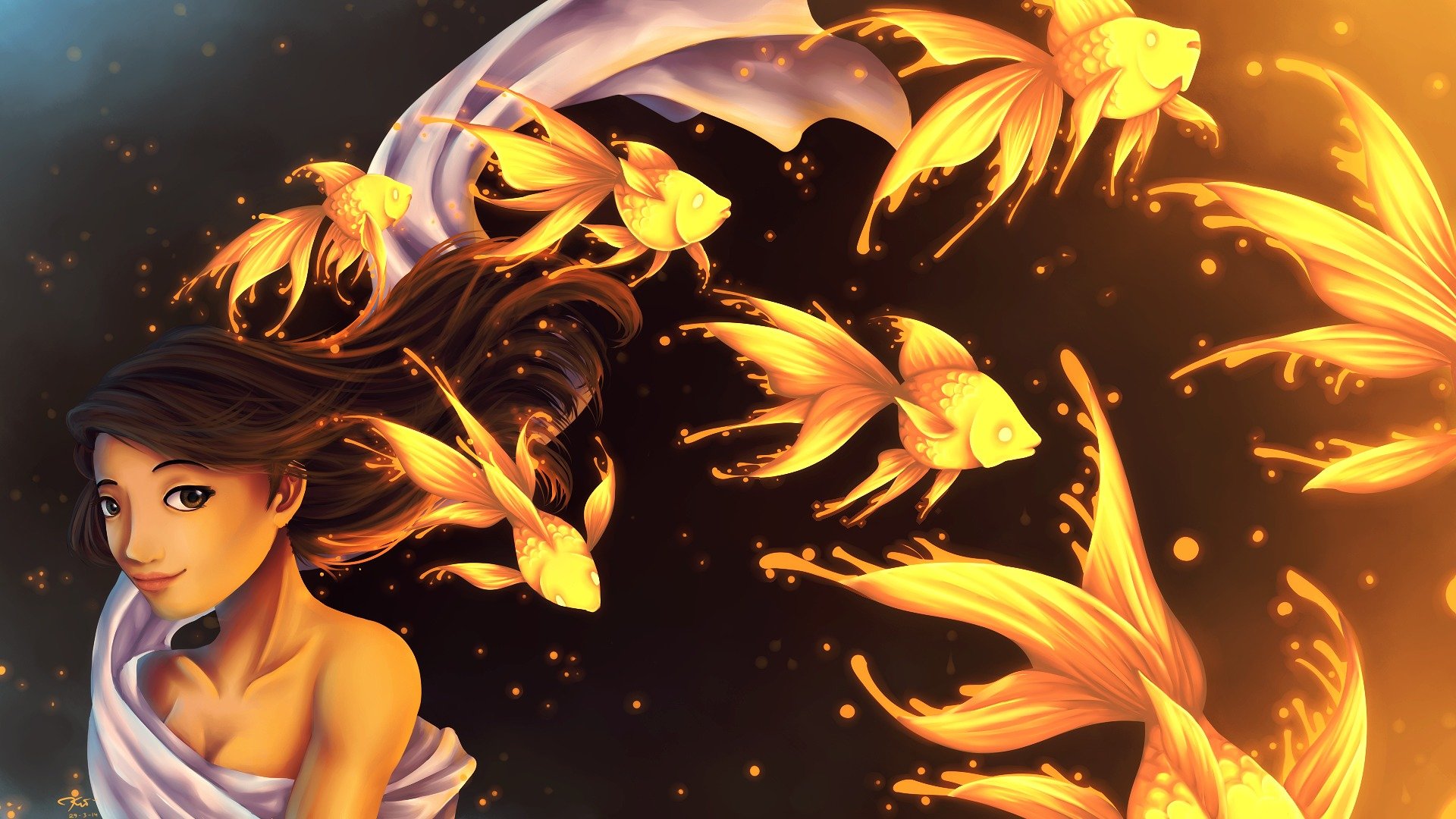 Tags:art, fille, cheveux, tissu, poissons, or, beaucoup