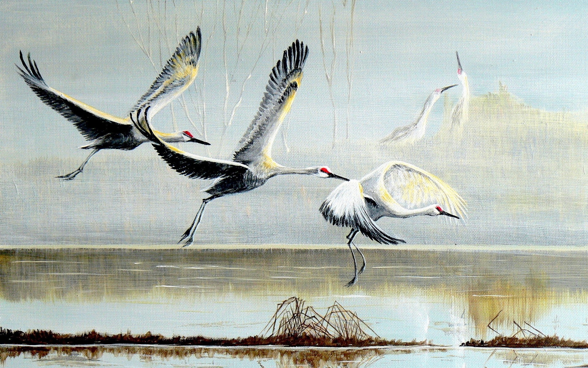 Photo de cigognes qui volent sur la rivière - fond d'écran de bureau