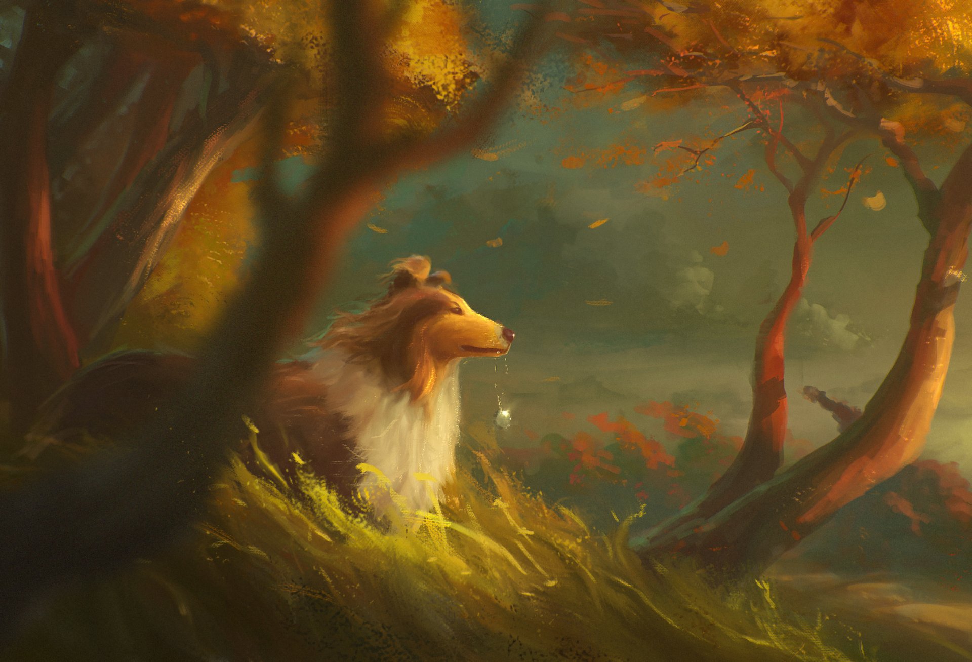 Tags:chien, collie, art, forêt, arbres, vent, automne, médaillon