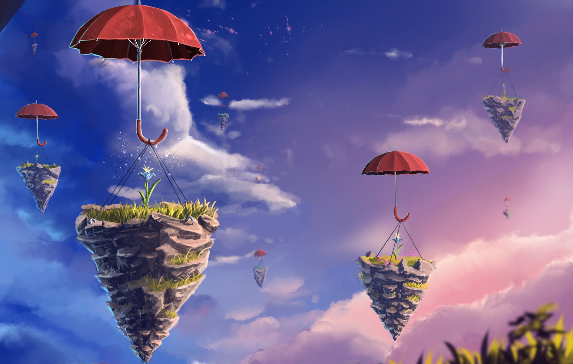 Voler sur des parapluies parmi les nuages petits îlots - fond d'écran de bureau