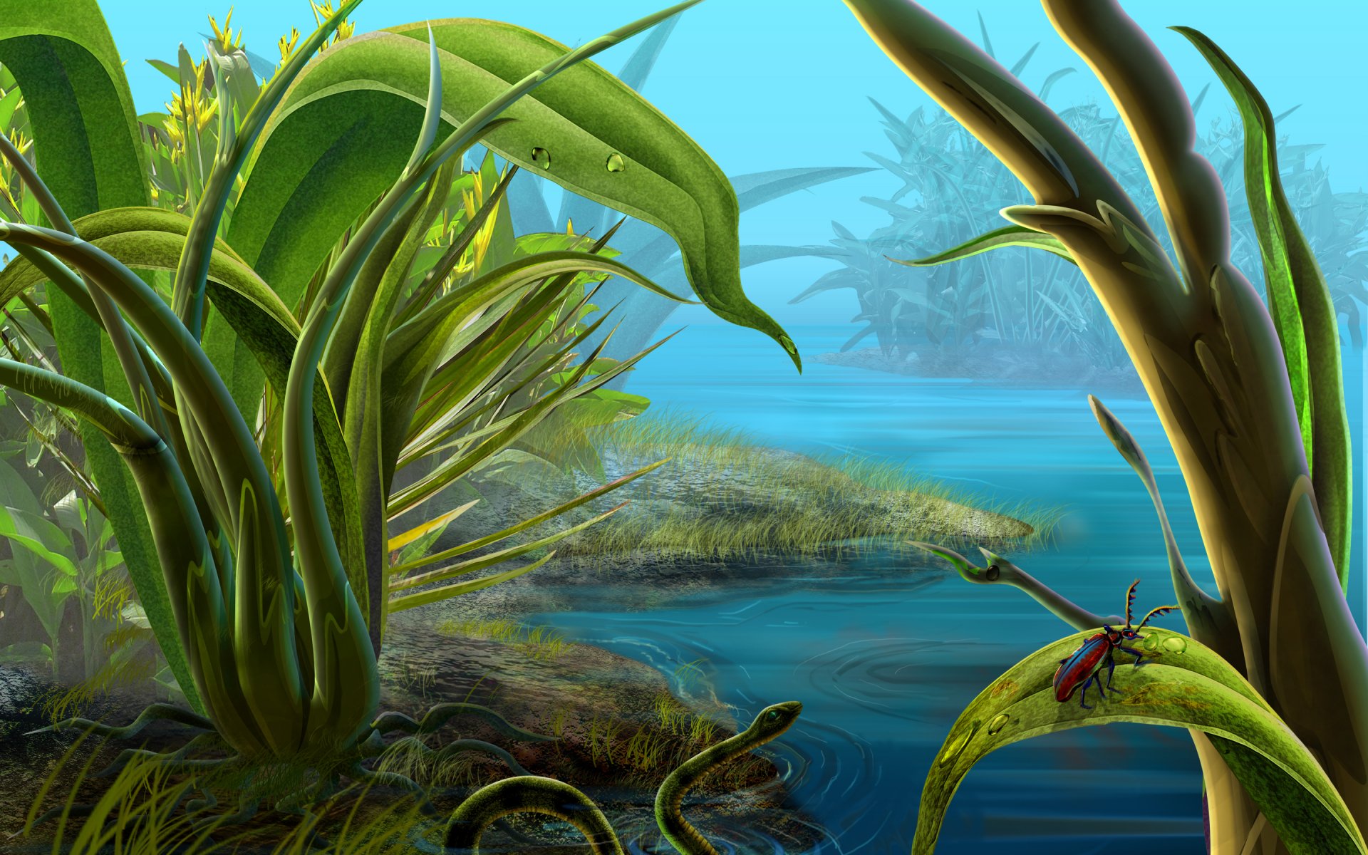 Tags:la rivière, haut, herbe, serpent.le scarabée.sur, une feuille de
