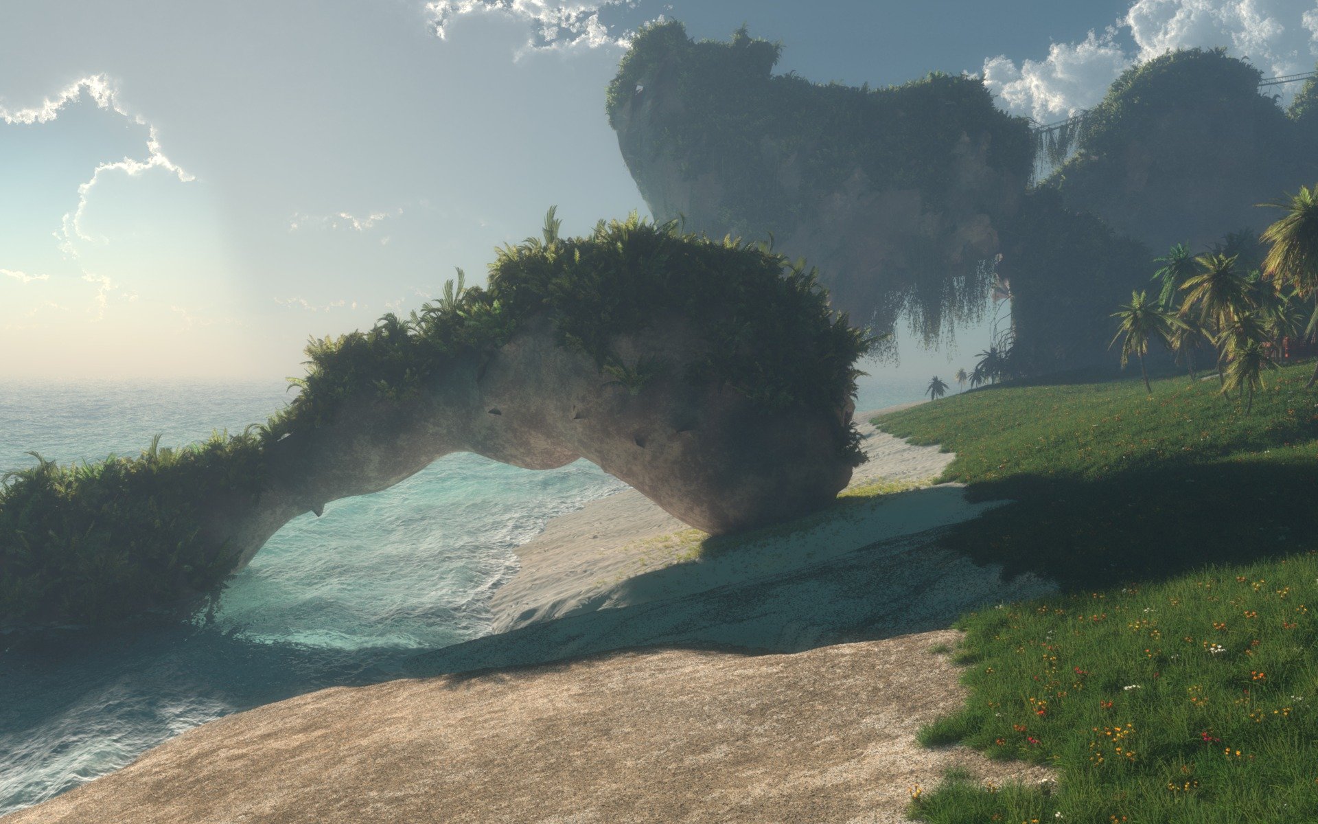 art klontak la brume le brouillard la mer les rochers le sable les palmiers