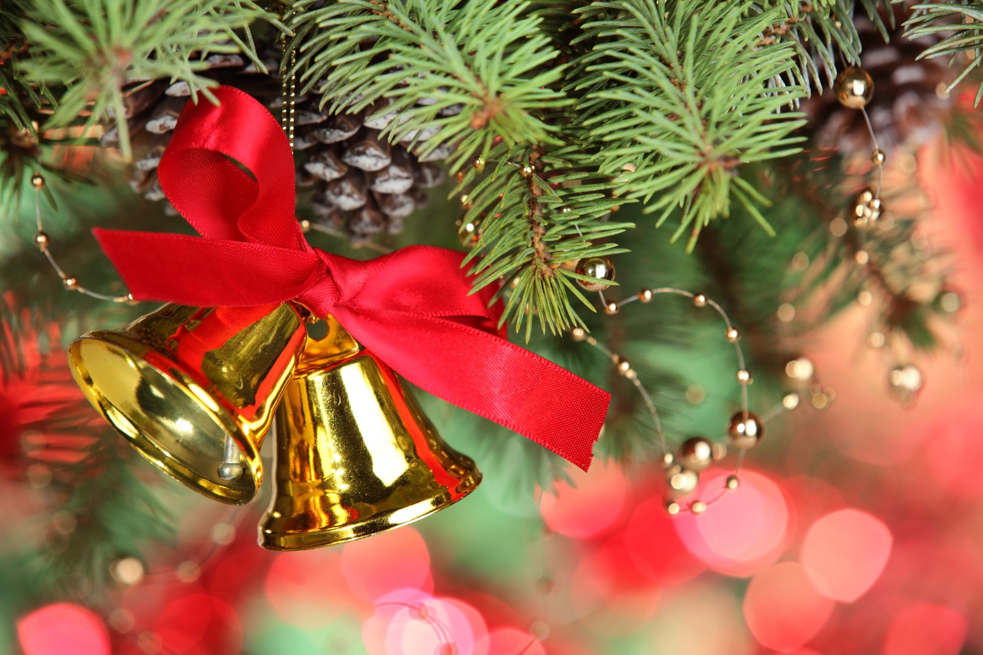 Décoration de cloches d'or avec un arc rouge sur l'arbre de noëlDécoration de cloches d'or avec un arc rouge sur l'arbre de Noël