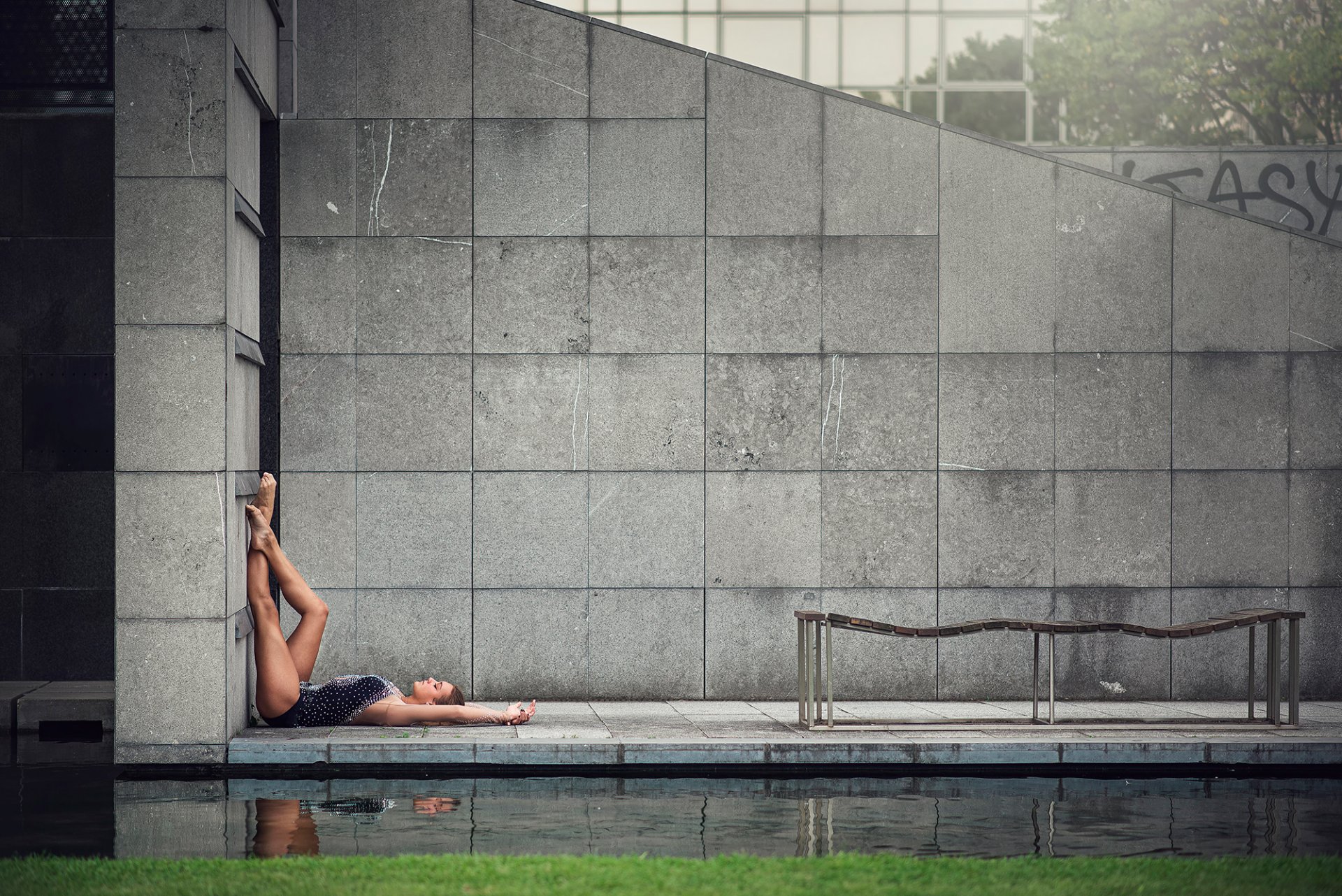 Jambes gracieuses d'une gymnaste près d'un mur grisJambes gracieuses d'une gymnaste près d'un mur gris
