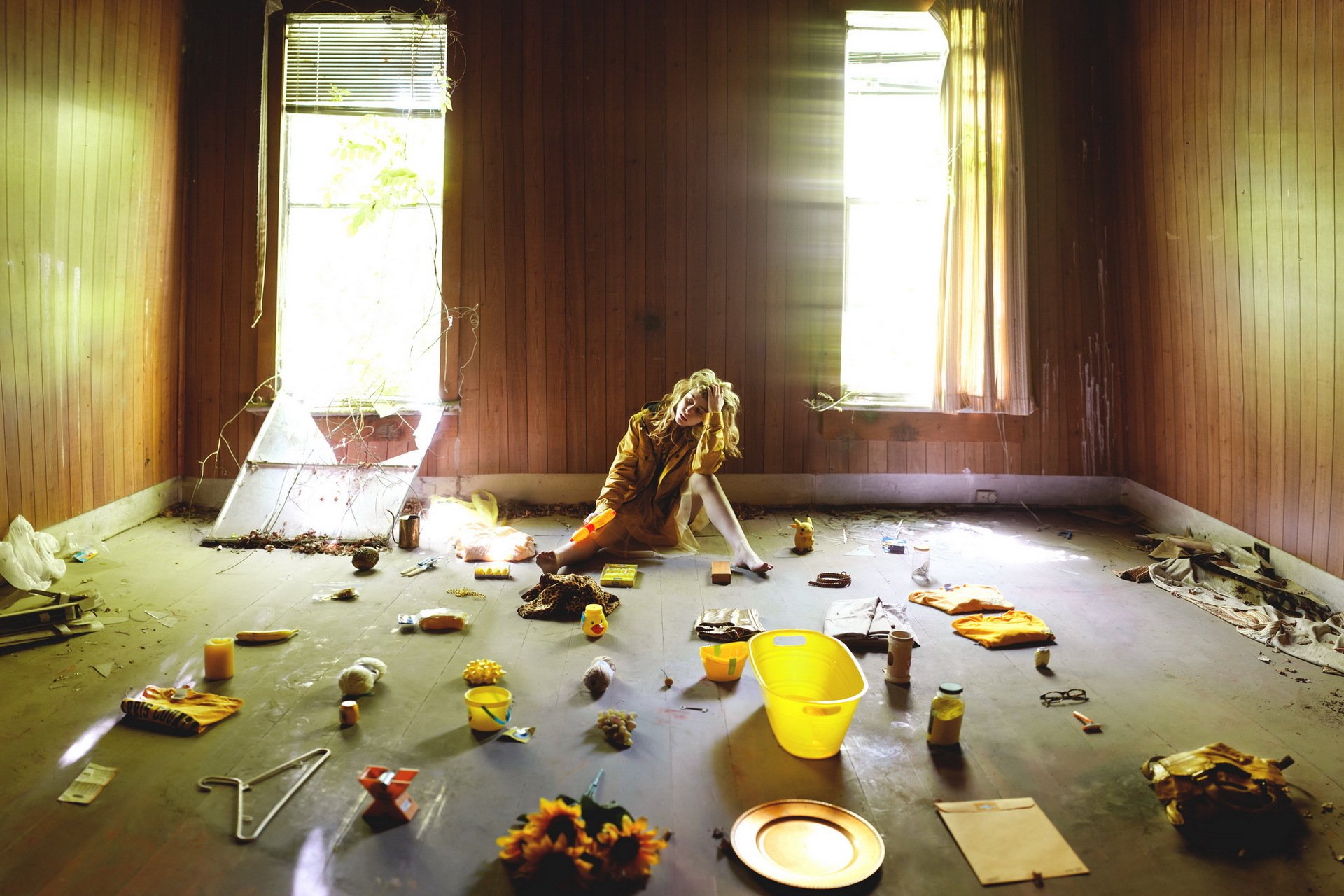 Fille avec des cheveux ondulés jaunes et un arc dans la chambre avec le désordre et les fenêtres ouvertes