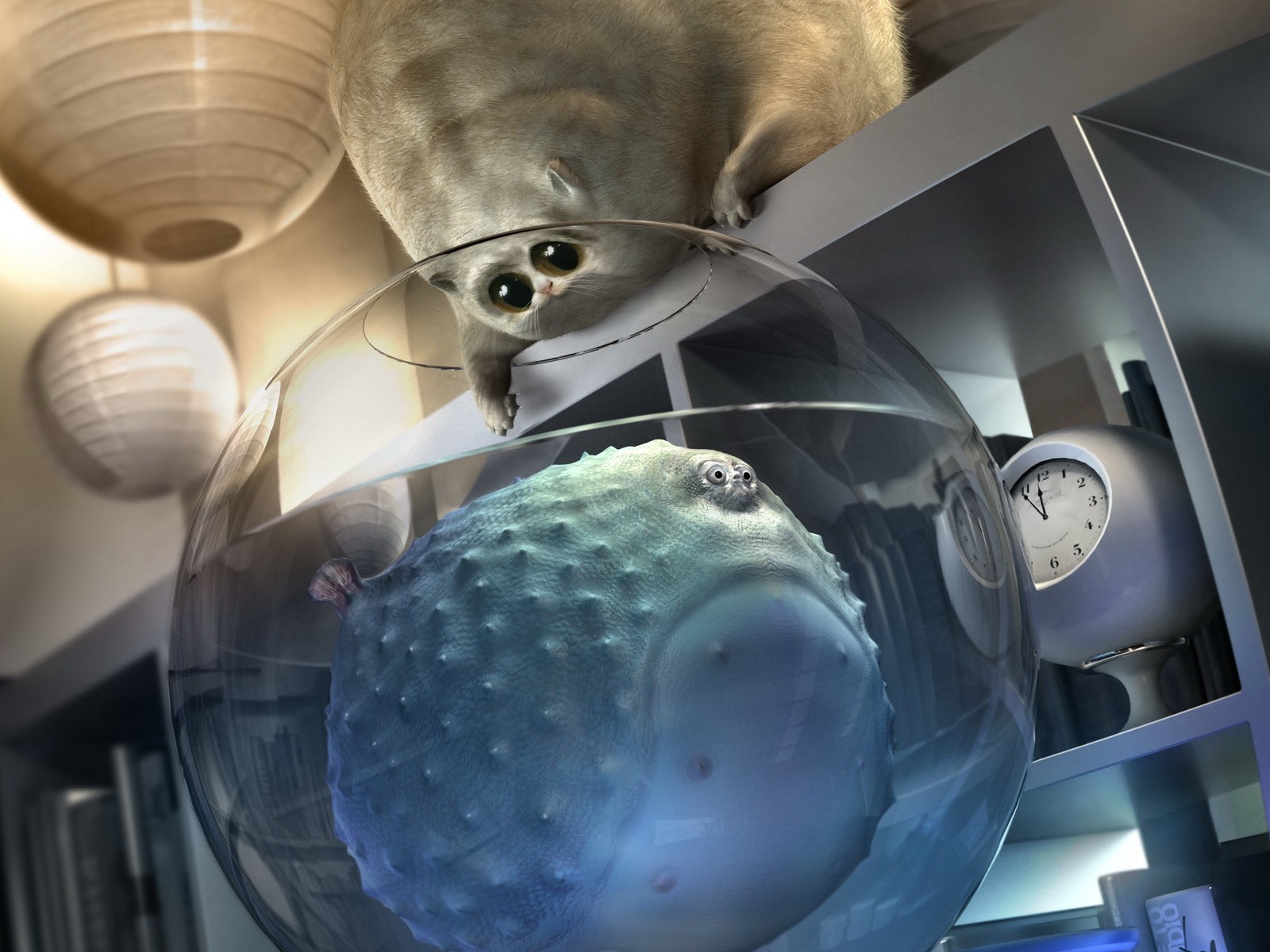 Poisson de dessin animé dans l'aquarium et le chat qui veut l'attraper
