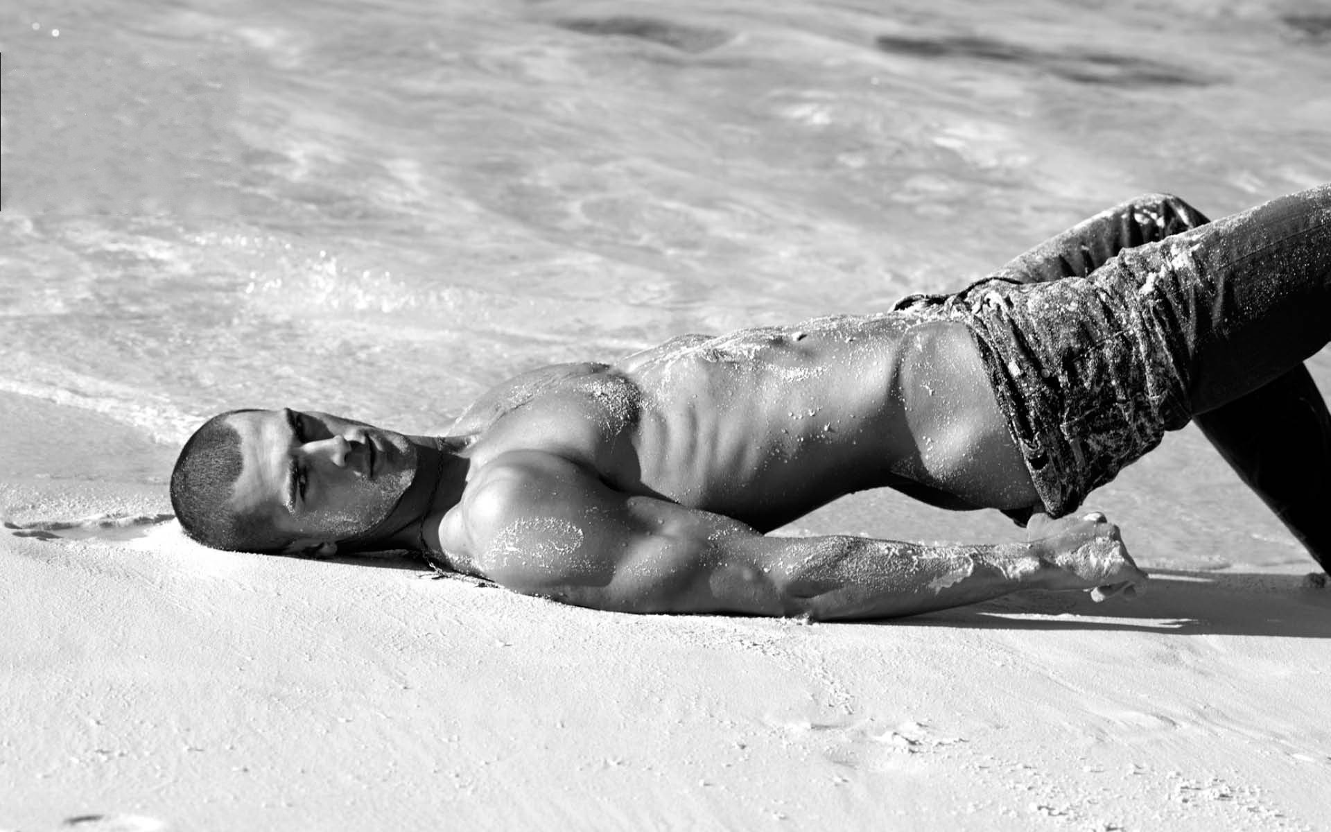 Photo en noir et blanc d'un beau mec musclé dans une pose érotique sur le sable