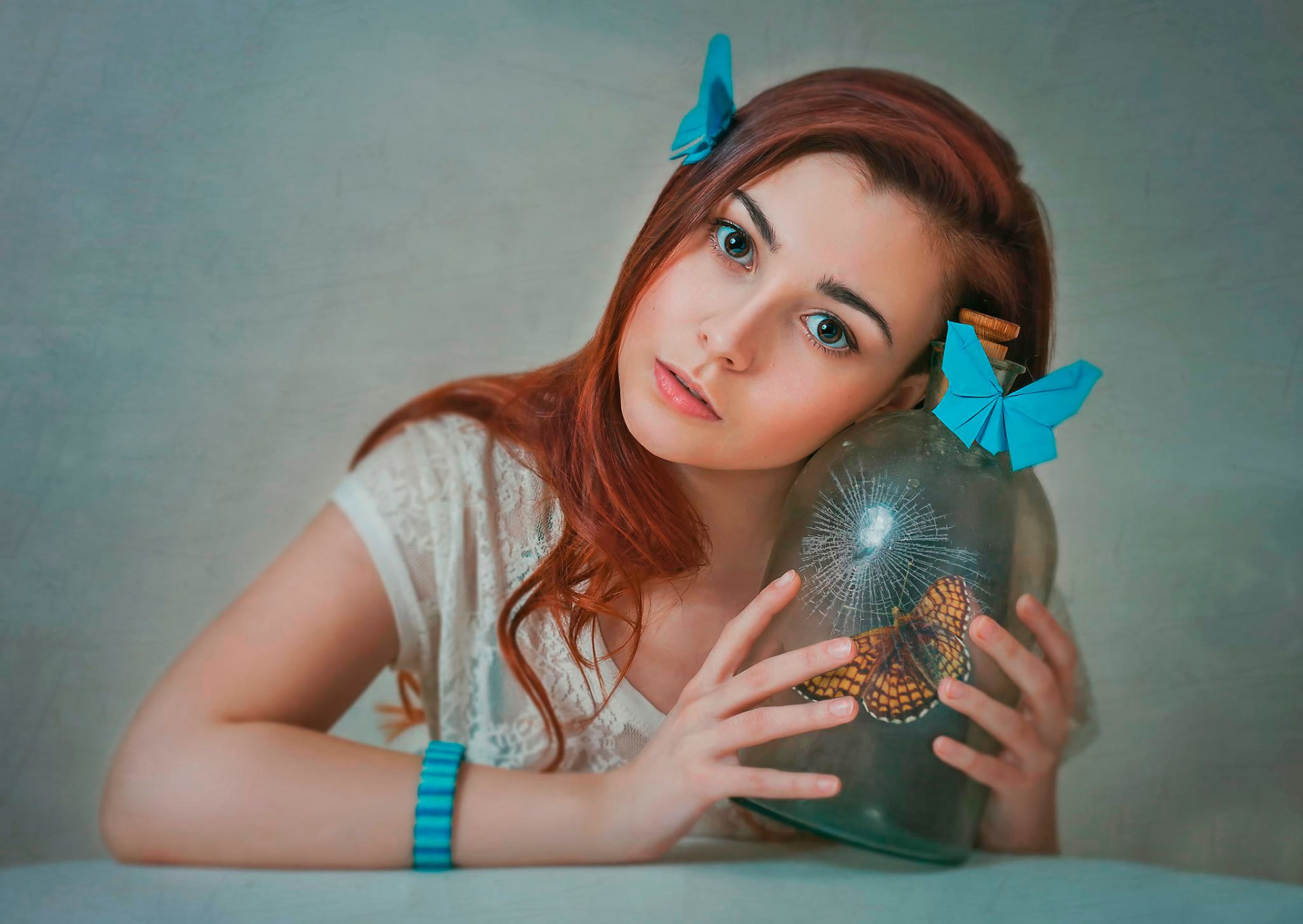 Fille Rousse avec des yeux verts et des taches de rousseur