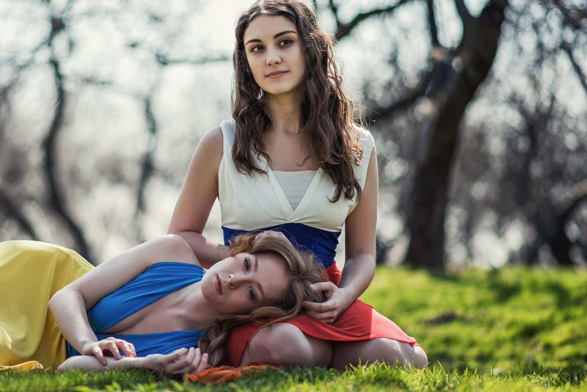 Filles en robes de couleur des drapeaux russes et ukrainiens
