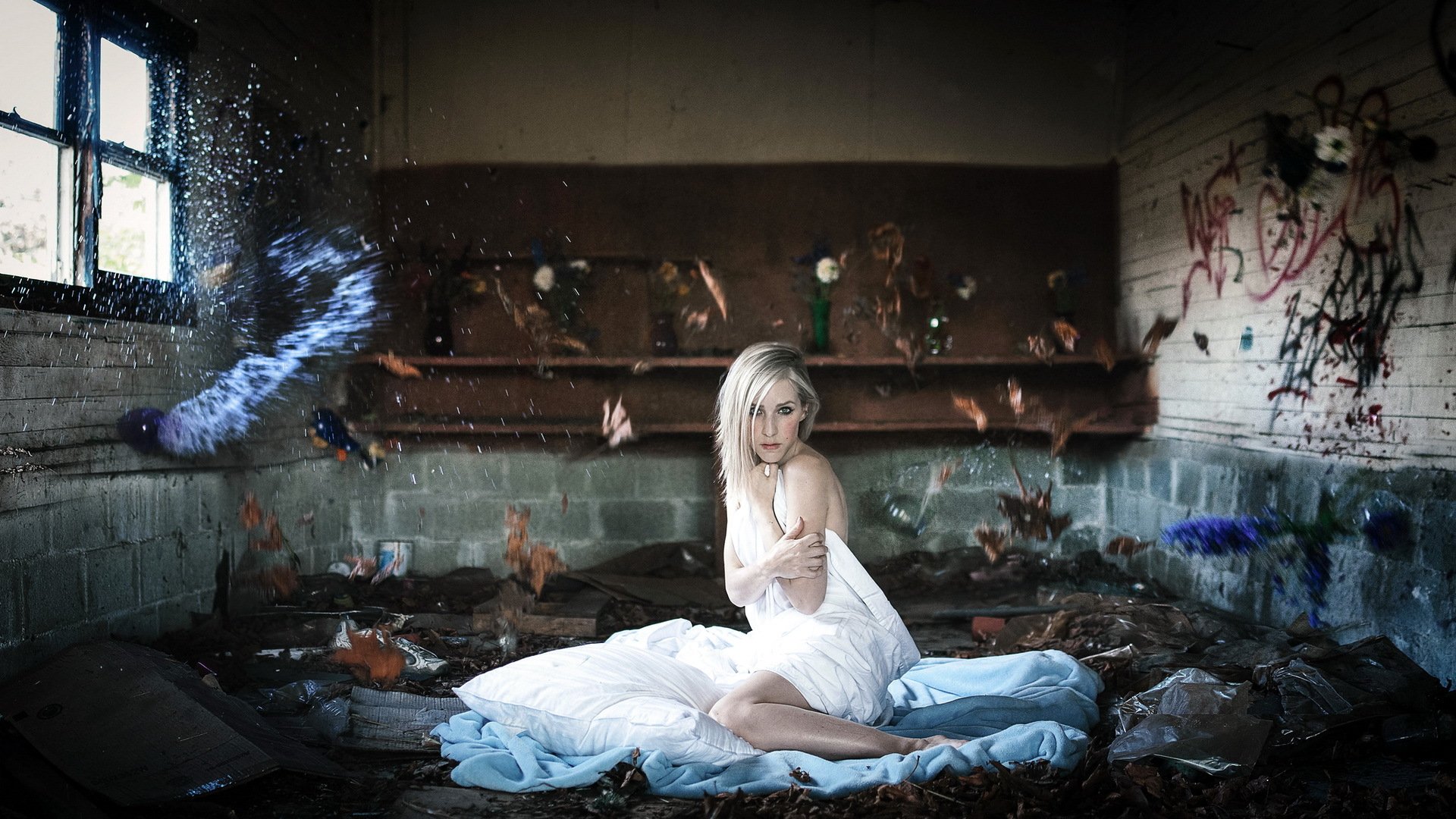 La ville, le toit de la maison, la hauteur de la belle jeune fille en robe du soirLa ville, le toit de la maison, la hauteur de la belle jeune fille en robe du soir