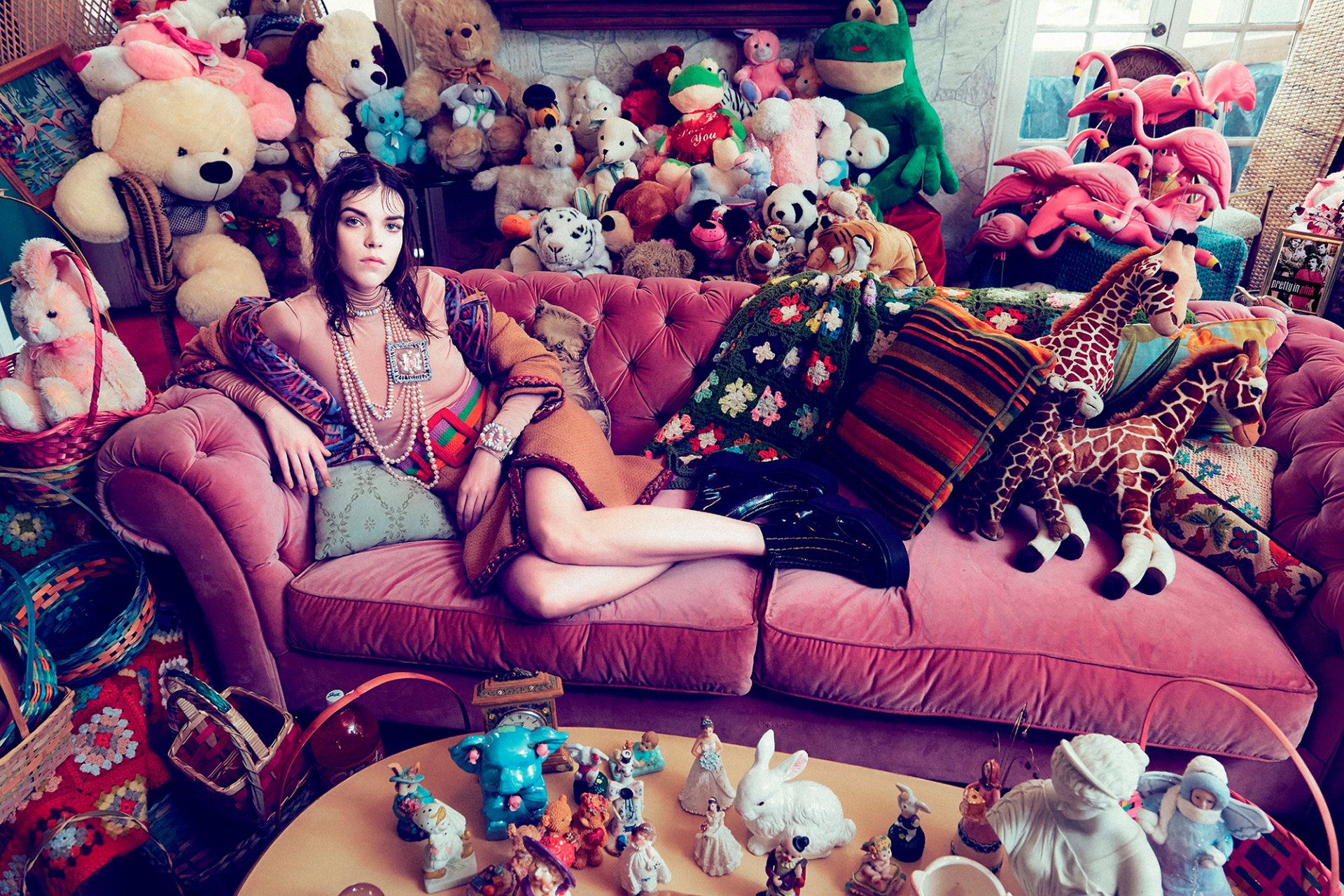 Megan Collison est assise sur le canapé parmi les jouets - fond d'écran de bureau
