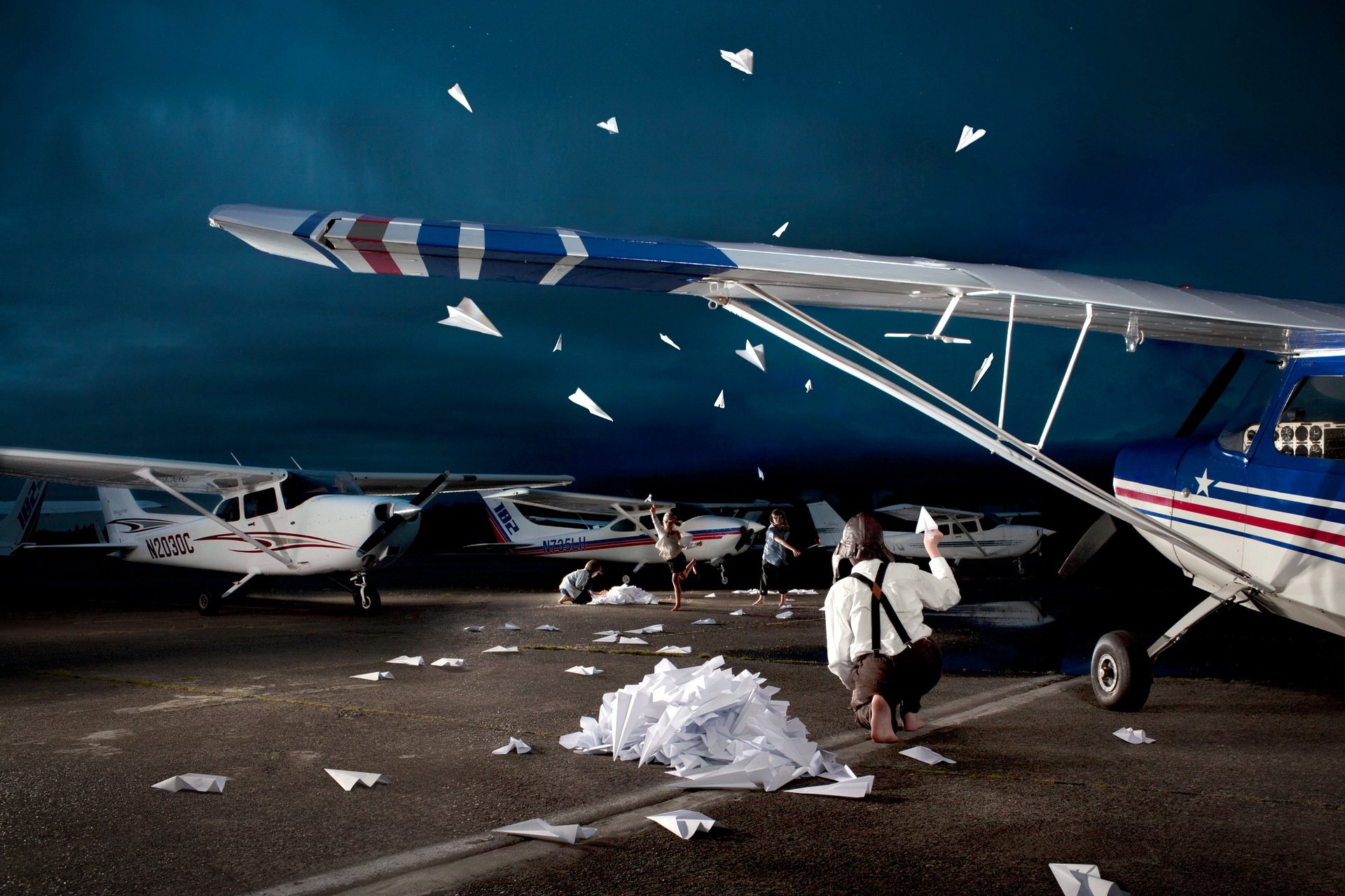 Un homme à l aéroport de lance des avions en papier - fond d'écran de bureau