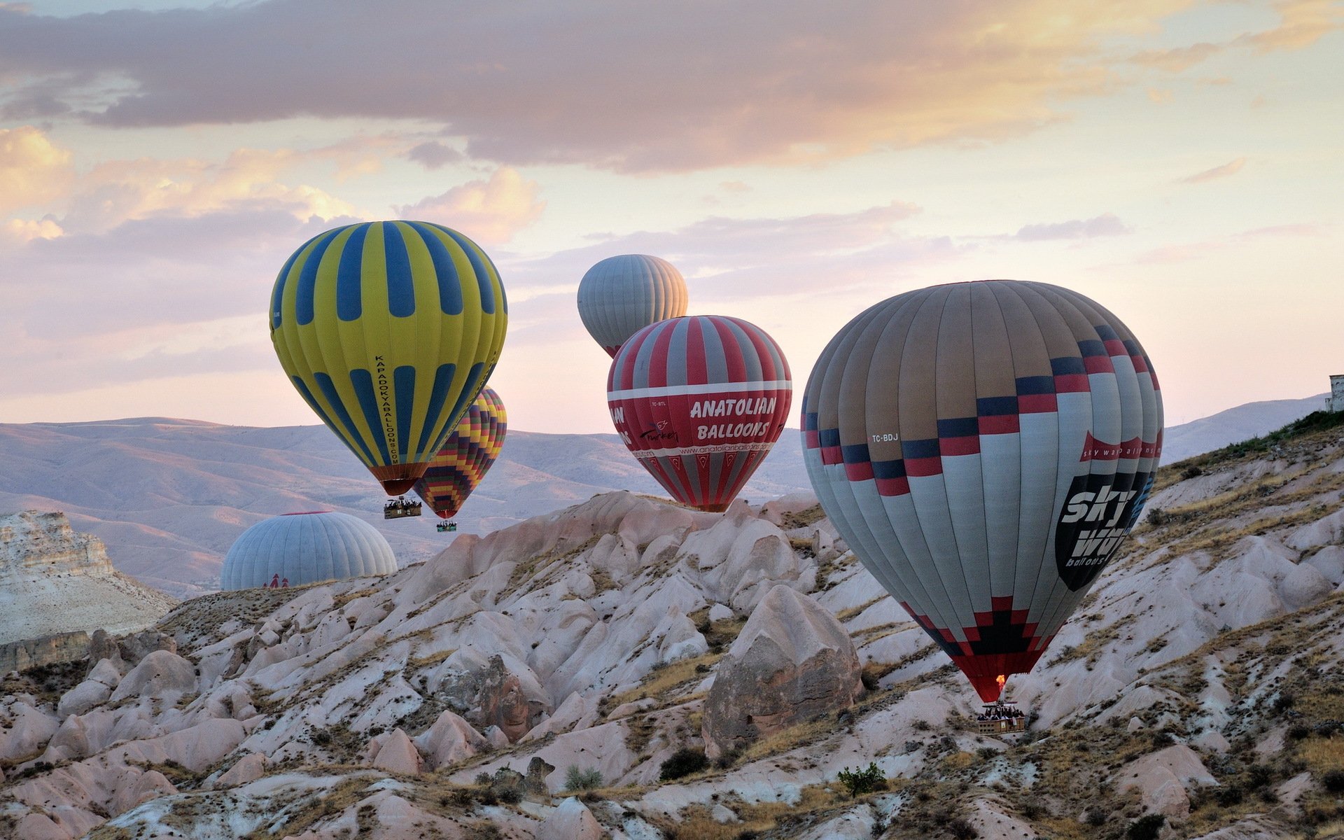 Ballons volent au-dessus du paysage de montagne - fond d'écran de téléphone