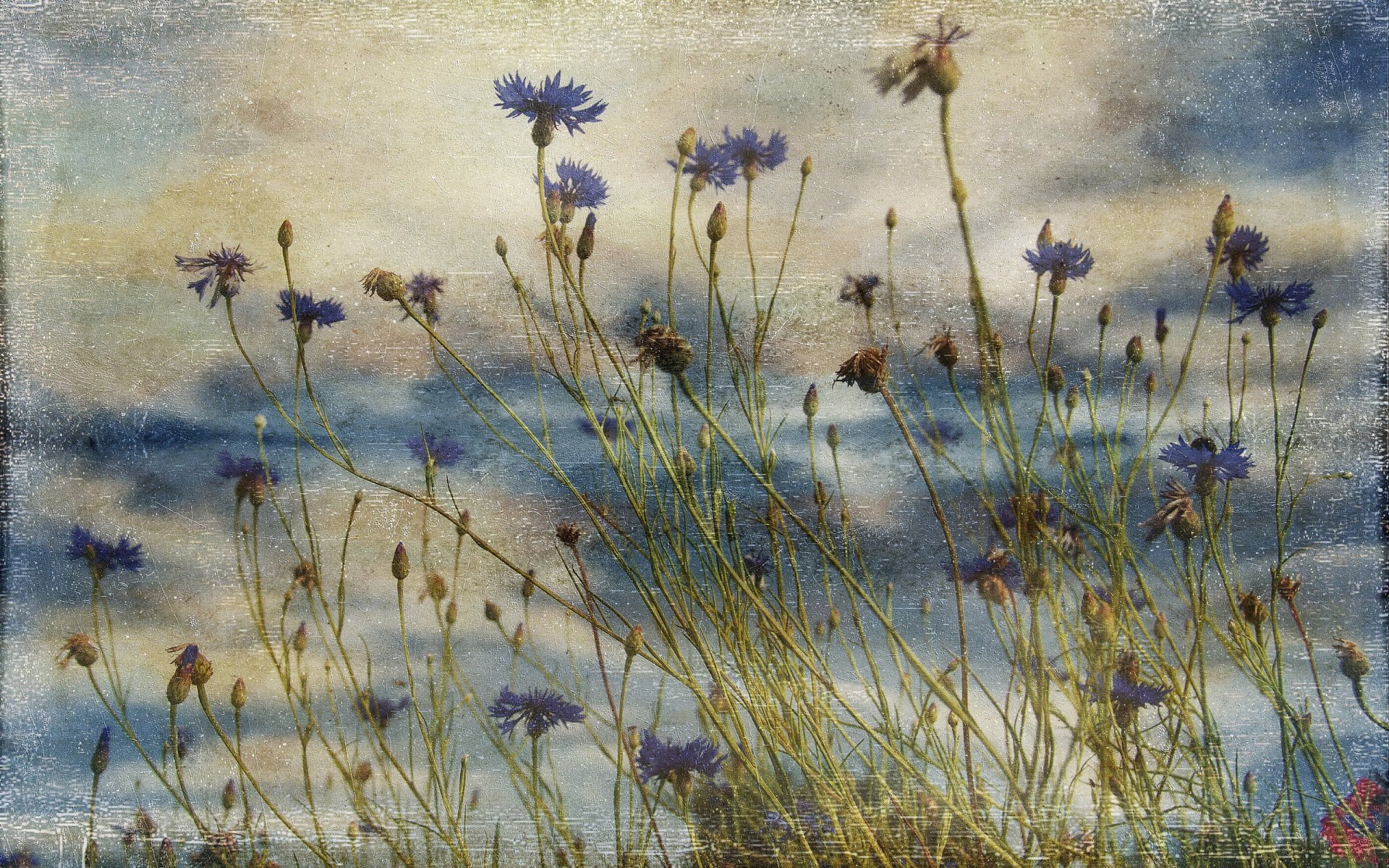 Fleurs bleues sur fond sombre - fond d'écran de bureau
