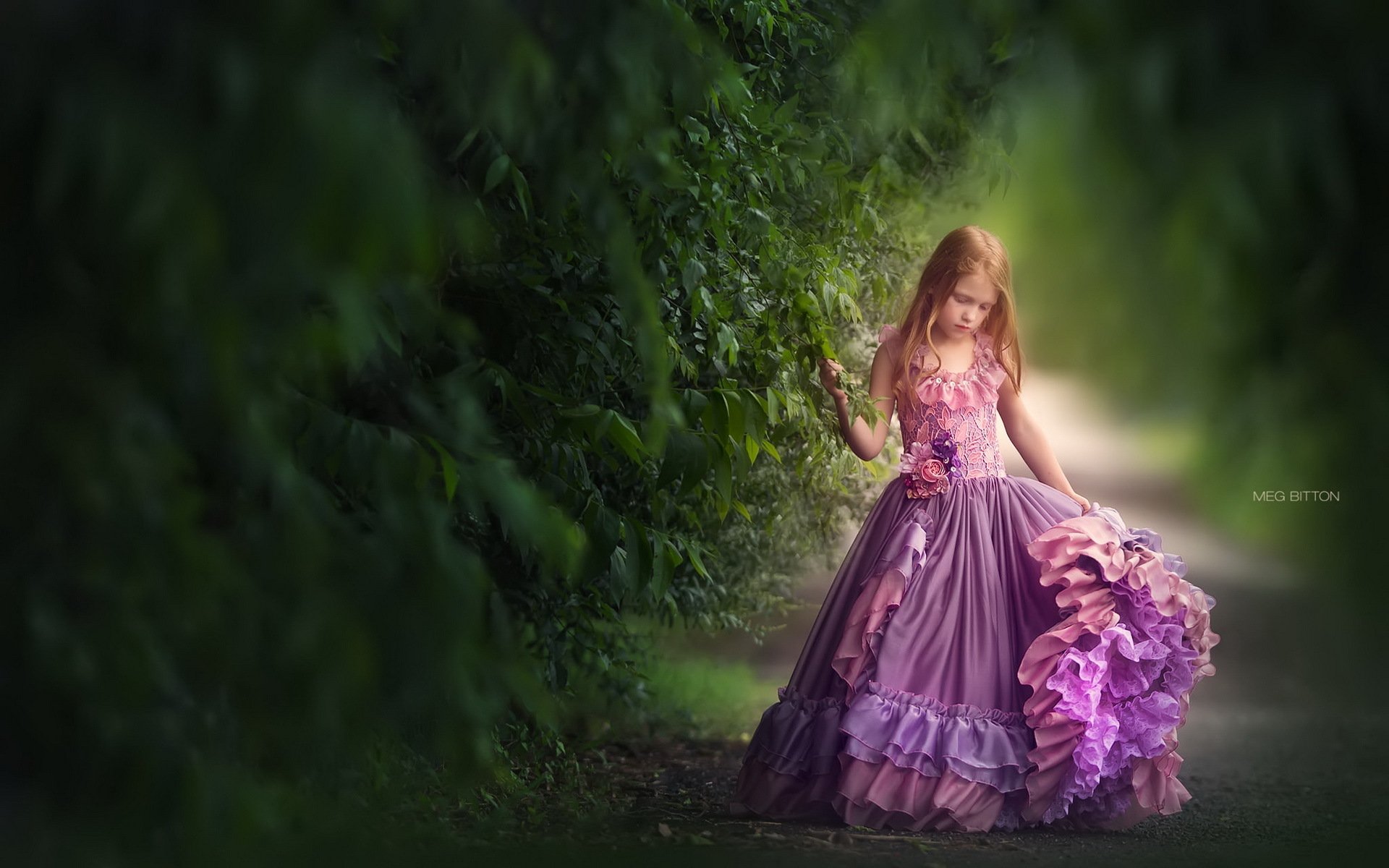 Princesse fille dans la forêt. Robe de princesse rose - fond d'écran de bureau