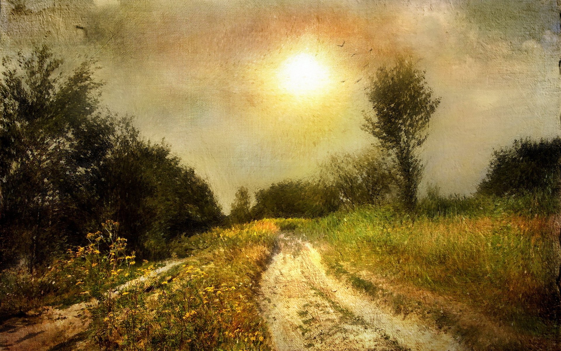 Route de campagne au coucher du soleil avec les oiseaux - fond d'écran de bureau