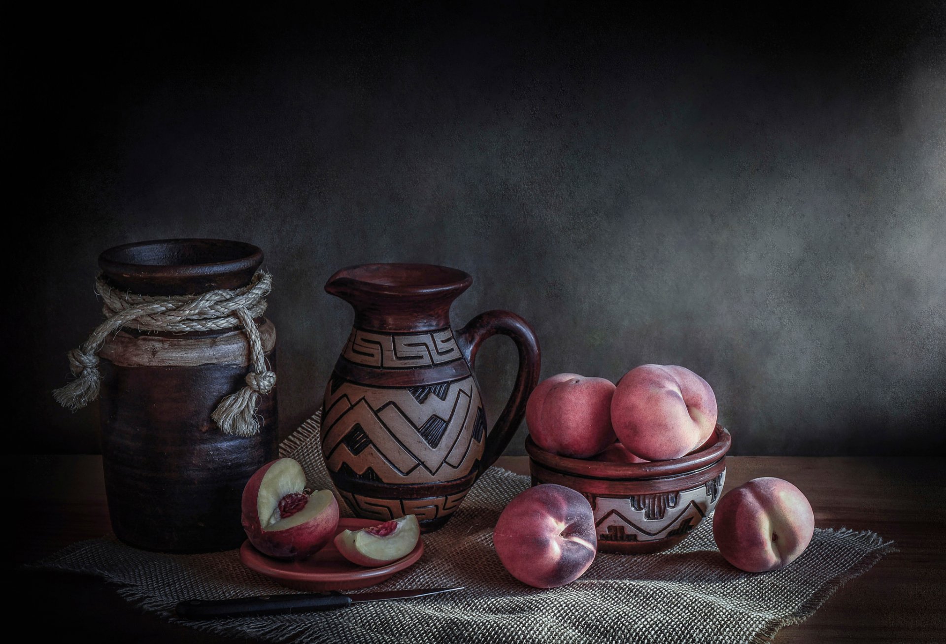 Nature morte avec des pêches et deux cruches