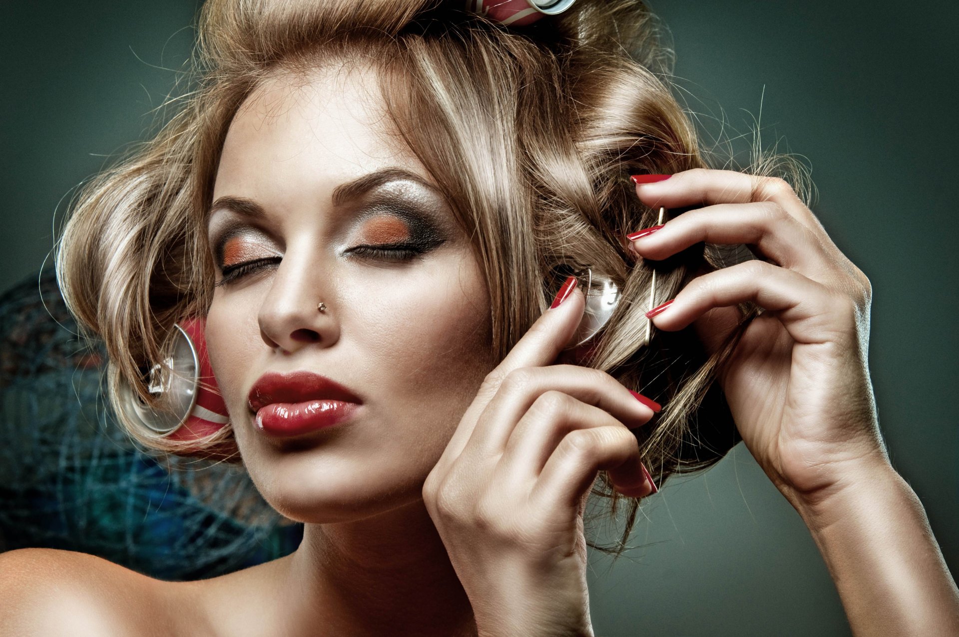 Fille avec piercing avec maquillage brillant et bigoudis - fond d'écran de téléphone