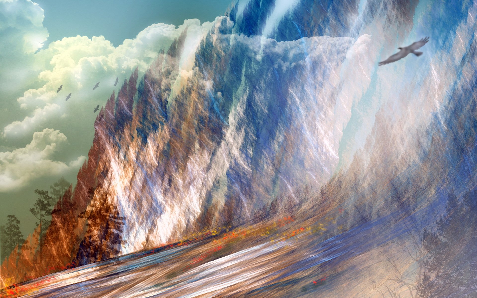 Paysage avec oiseau sur fond coloré - fond d'écran de téléphone