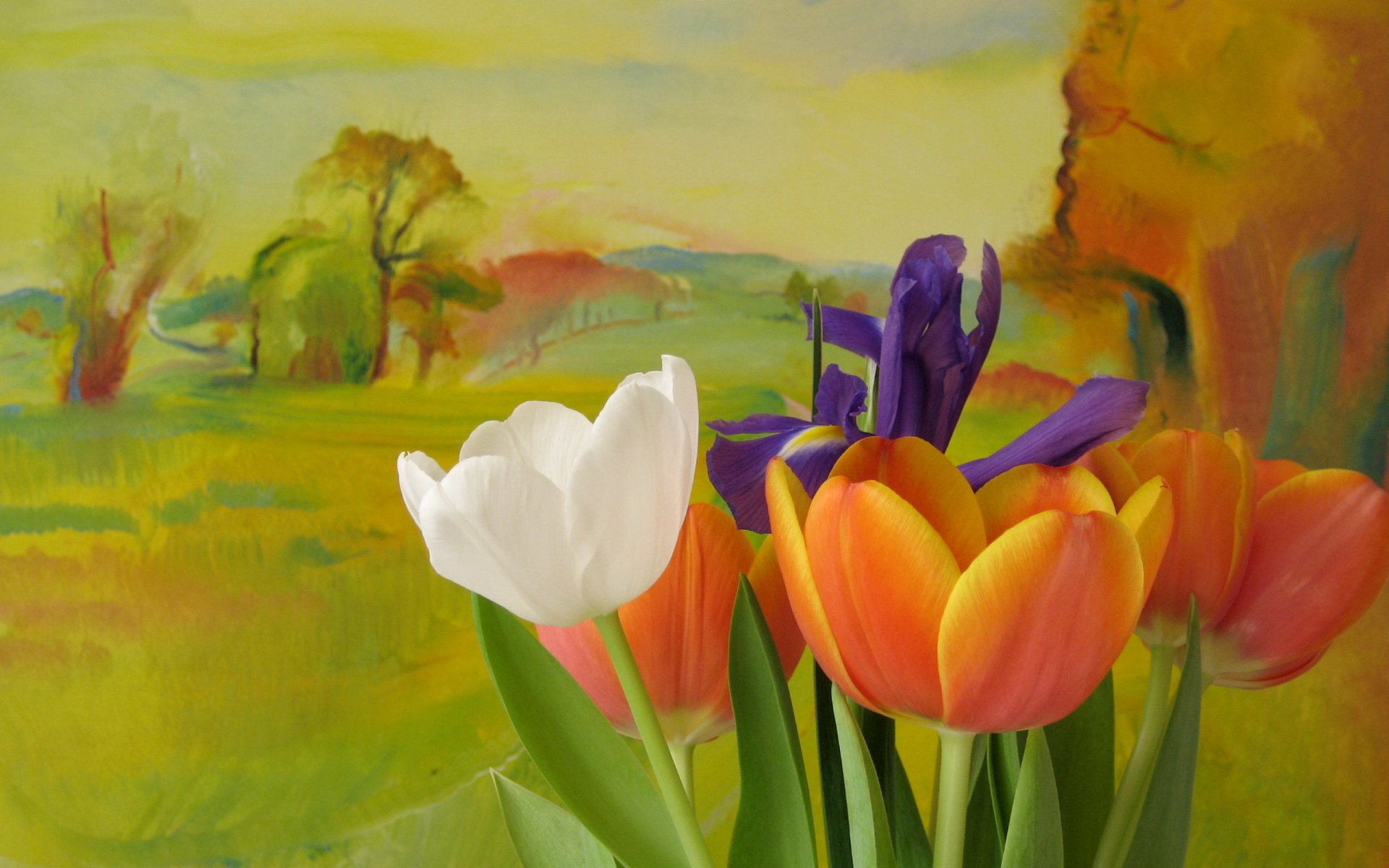 Tulipes ouvertes sur fond de vallée verte - fond d'écran de téléphone