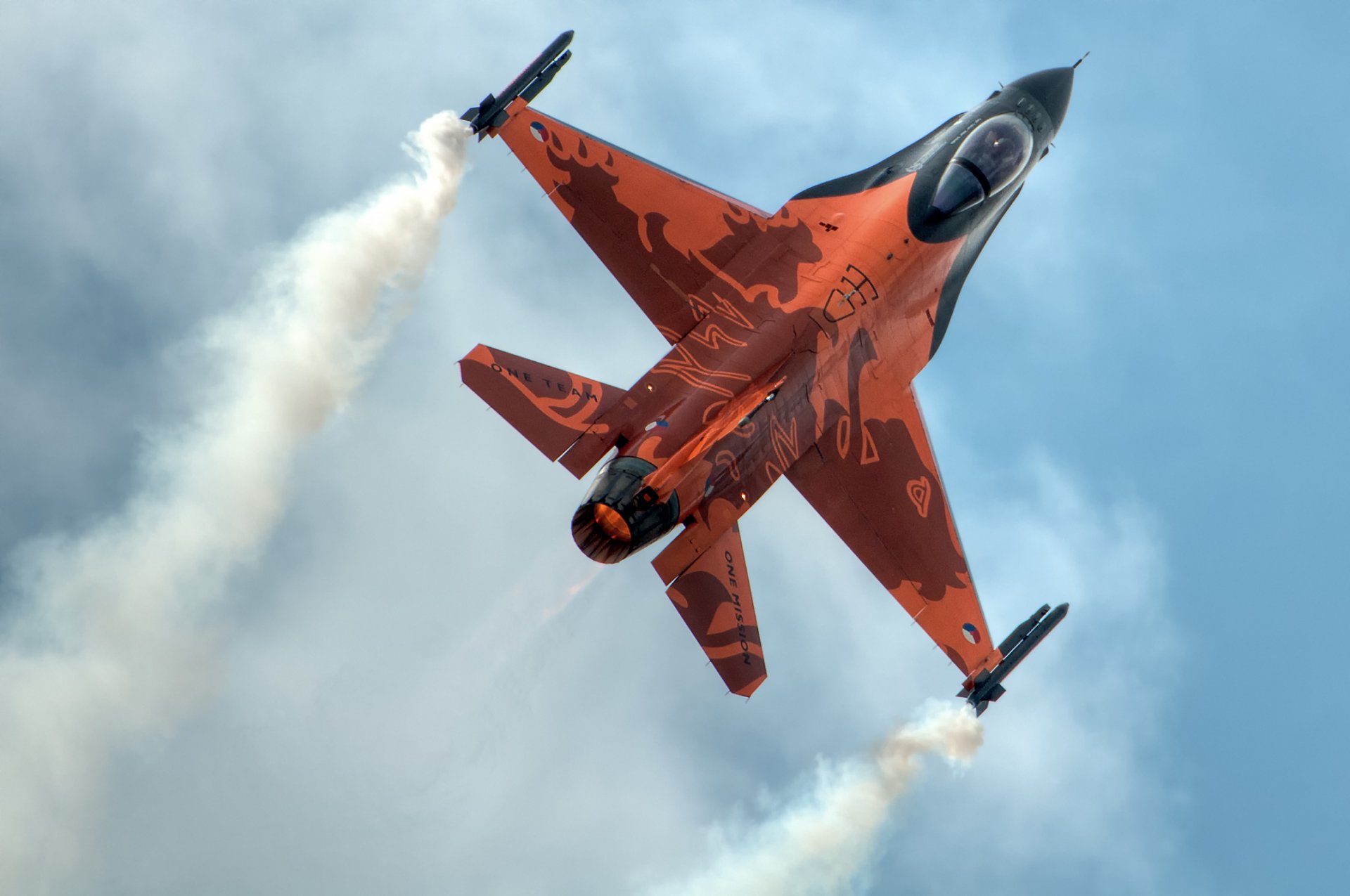 Chasseur polyvalent f-16" fighting falcon " en coloration rouge sur fond de ciel bleu.Chasseur polyvalent F-16" Fighting Falcon " en coloration rouge sur fond de ciel bleu.