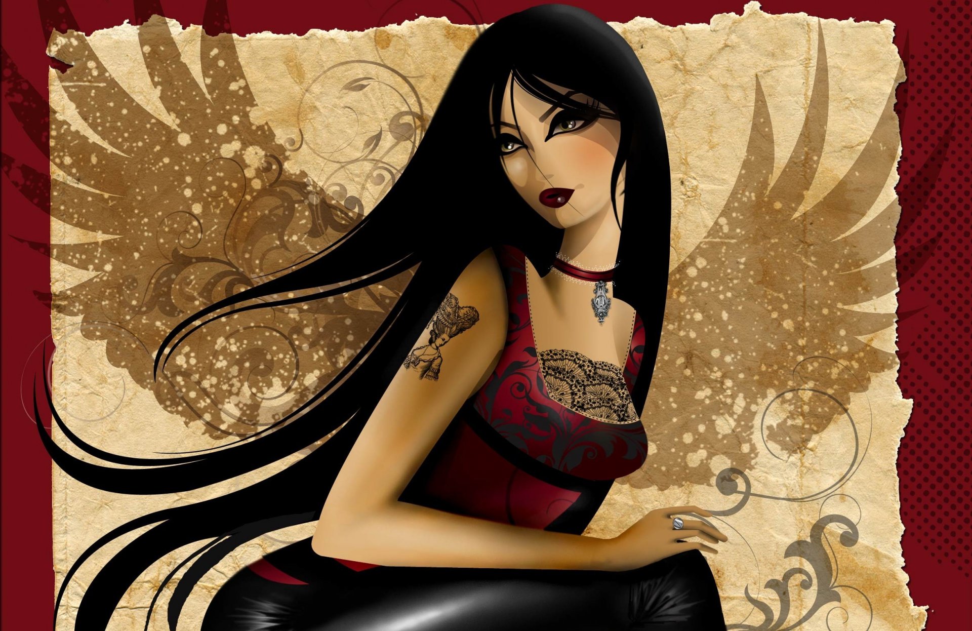 Dessin d'une fille avec de longs cheveux noirs et un tatouage sur le bras