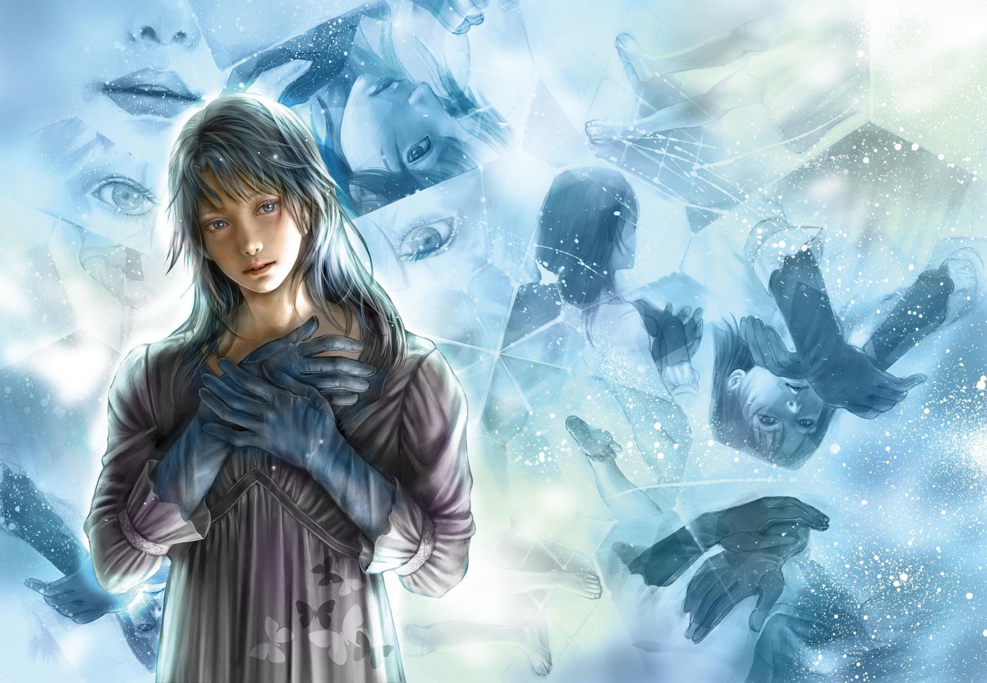 Fille triste dans des gants noirs posant sur le fond des croquis d'elle-mêmeFille triste dans des gants noirs posant sur le fond des croquis d'elle-même