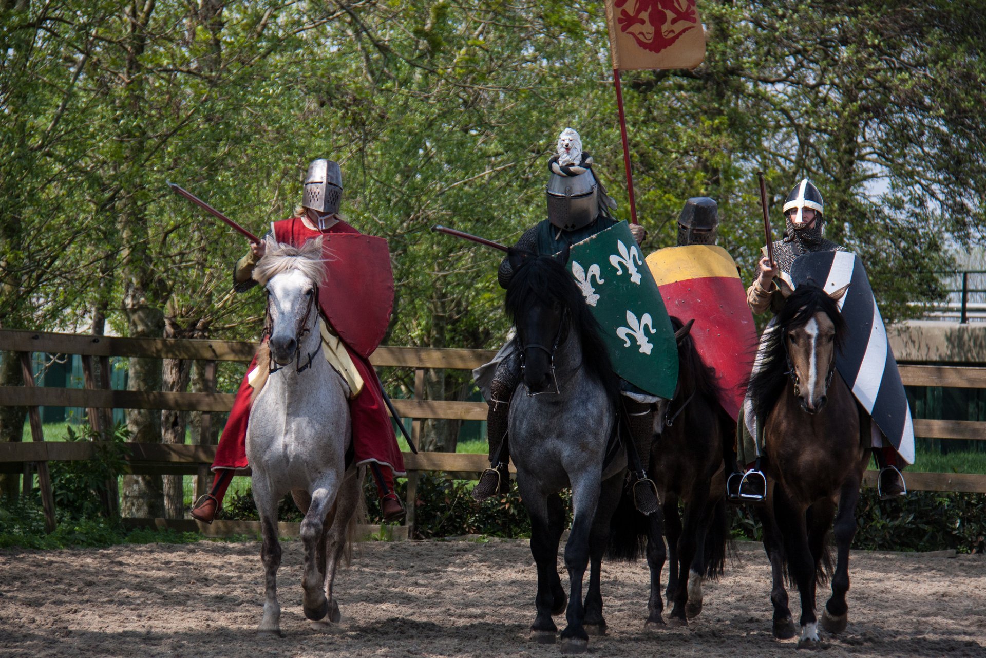 Guerrier en armure de fer avec épée et bouclier sur fond de forêt brumeuse