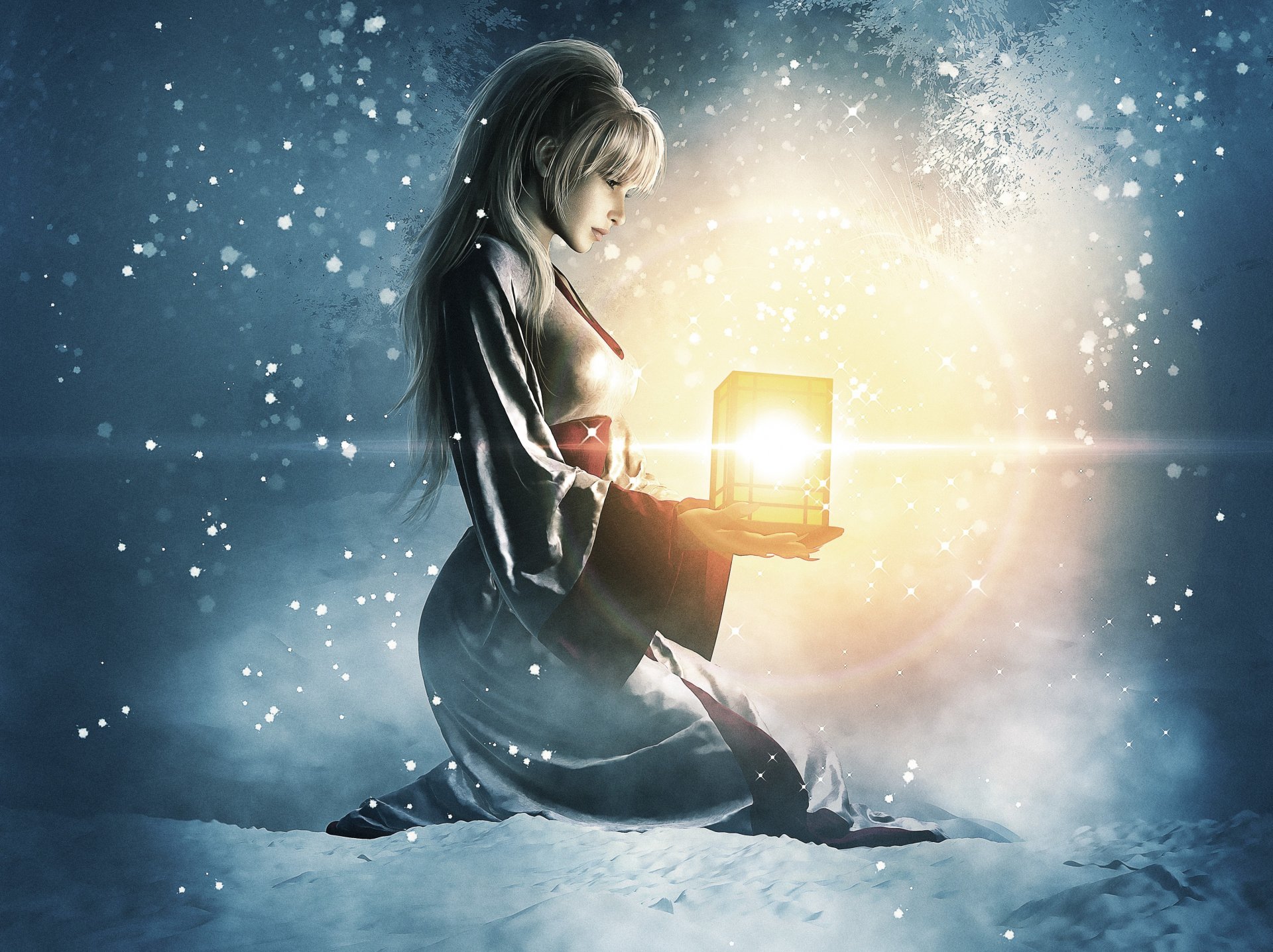 Jeune fille en kimono assis sur la neige avec une lanterne à la mainJeune fille en kimono assis sur la neige avec une lanterne à la main