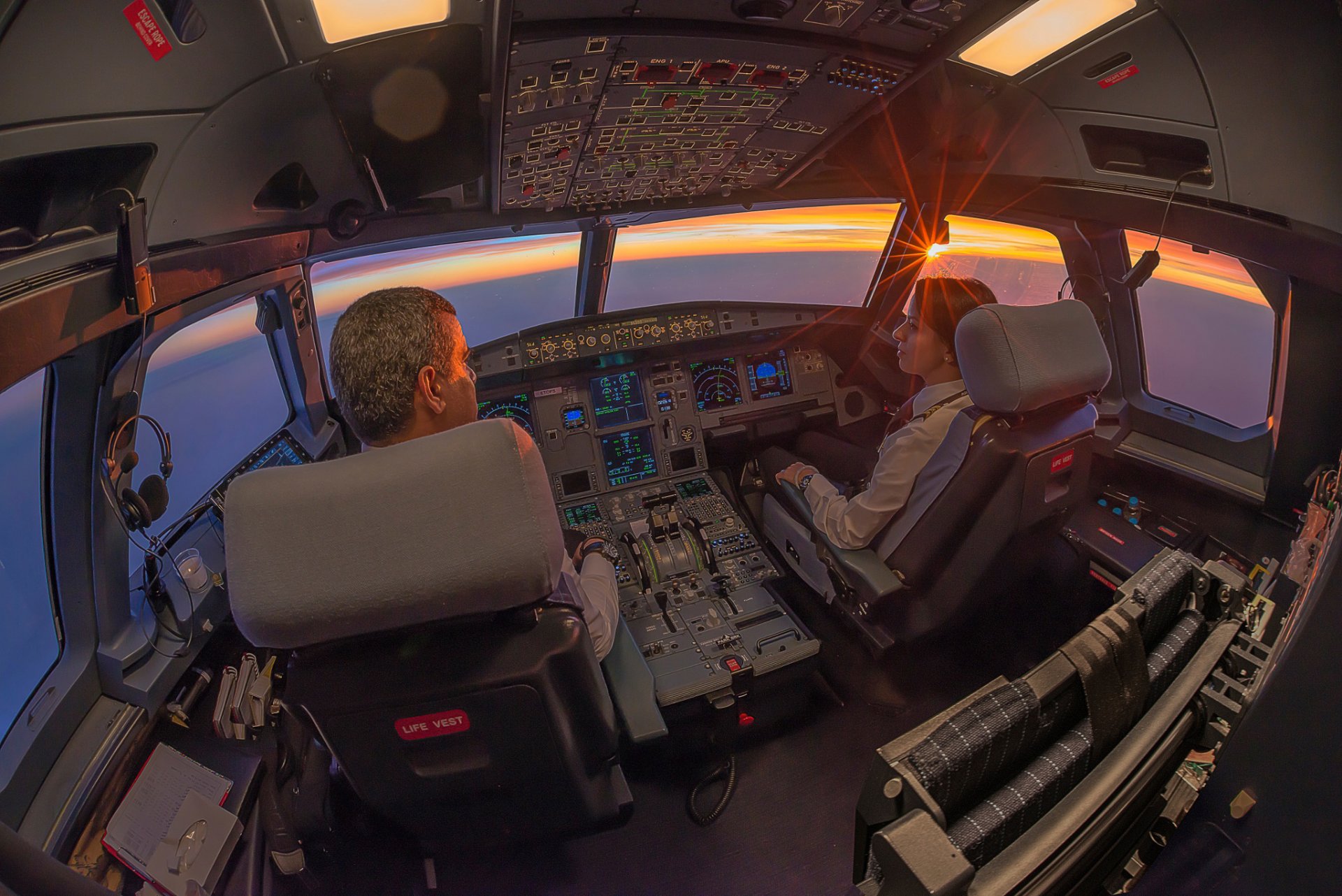 Cabine de pilote dans un airbus, aube, homme et femmeCabine de pilote dans un Airbus, aube, homme et femme