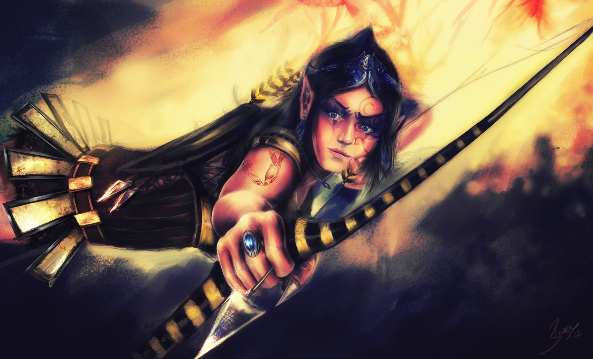 Elfe fille aux cheveux blancs avec un arc dans les mains de l'artElfe fille aux cheveux blancs avec un arc dans les mains de l'art
