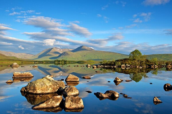 Pierres au bord du lac sur fond de montagnes et de nuagesPierres au bord du lac sur fond de montagnes et de nuages