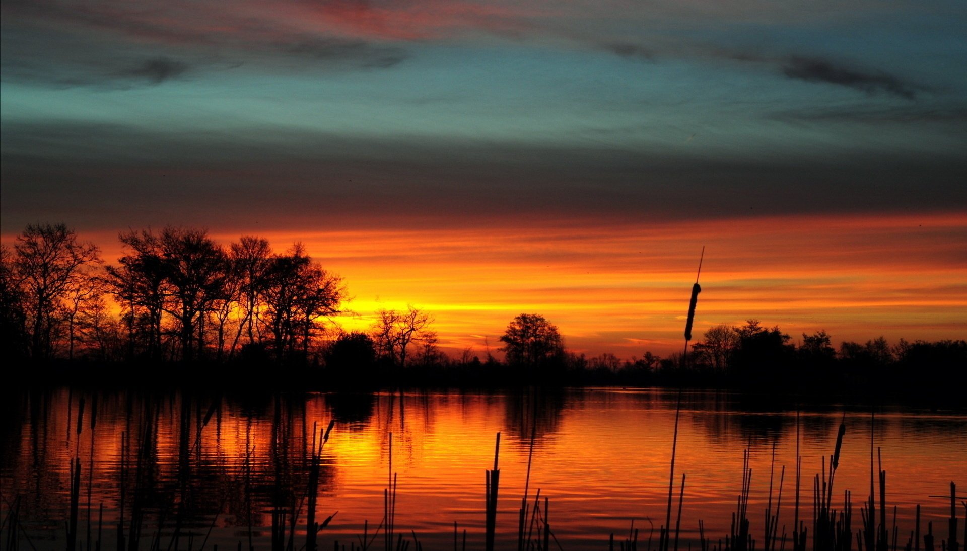 Beau coucher de soleil sur le lac avec des roseauxBeau coucher de soleil sur le lac avec des roseaux