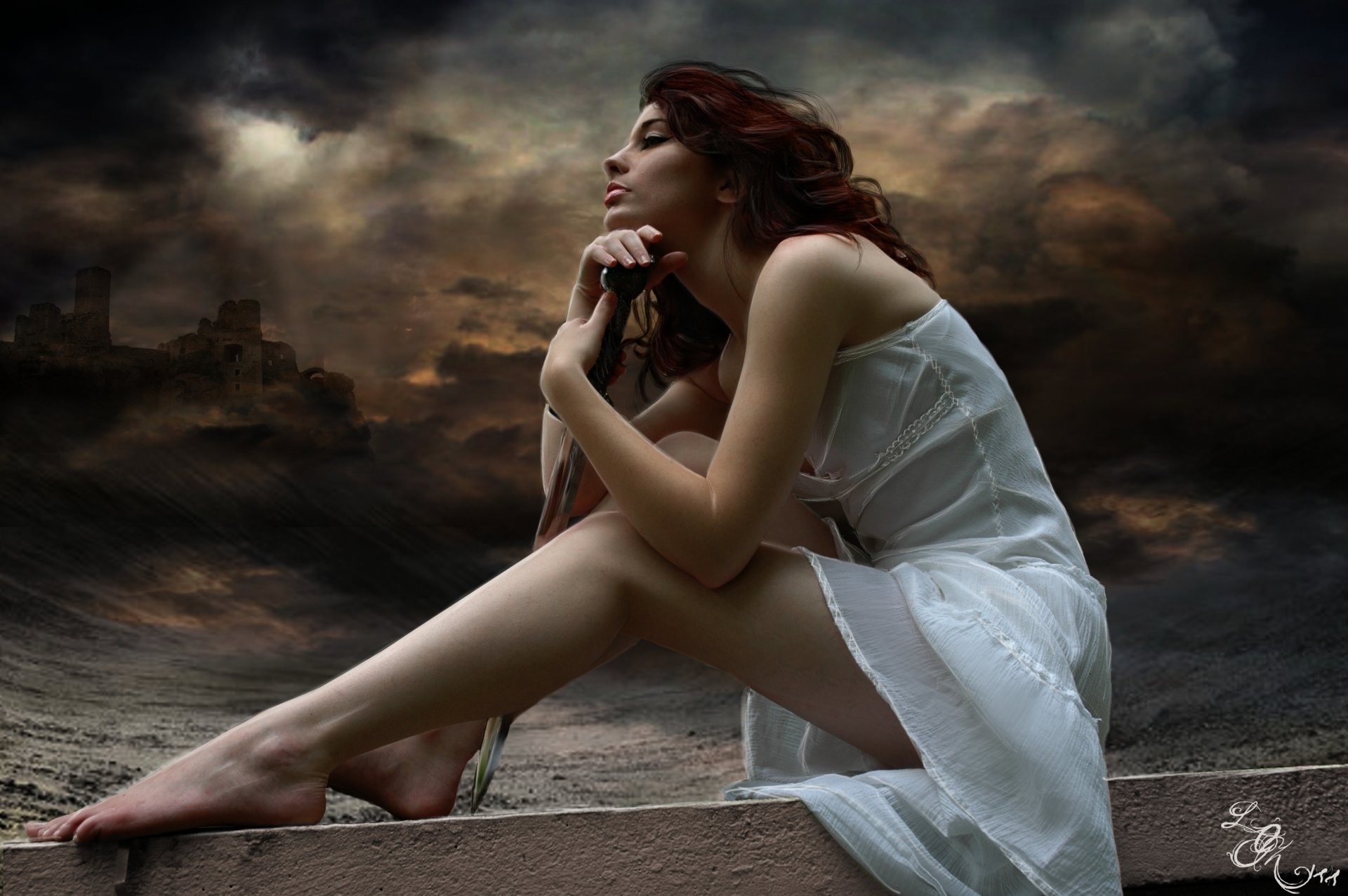 Blonde en blanc inhale l'air de la mer sur le rivage