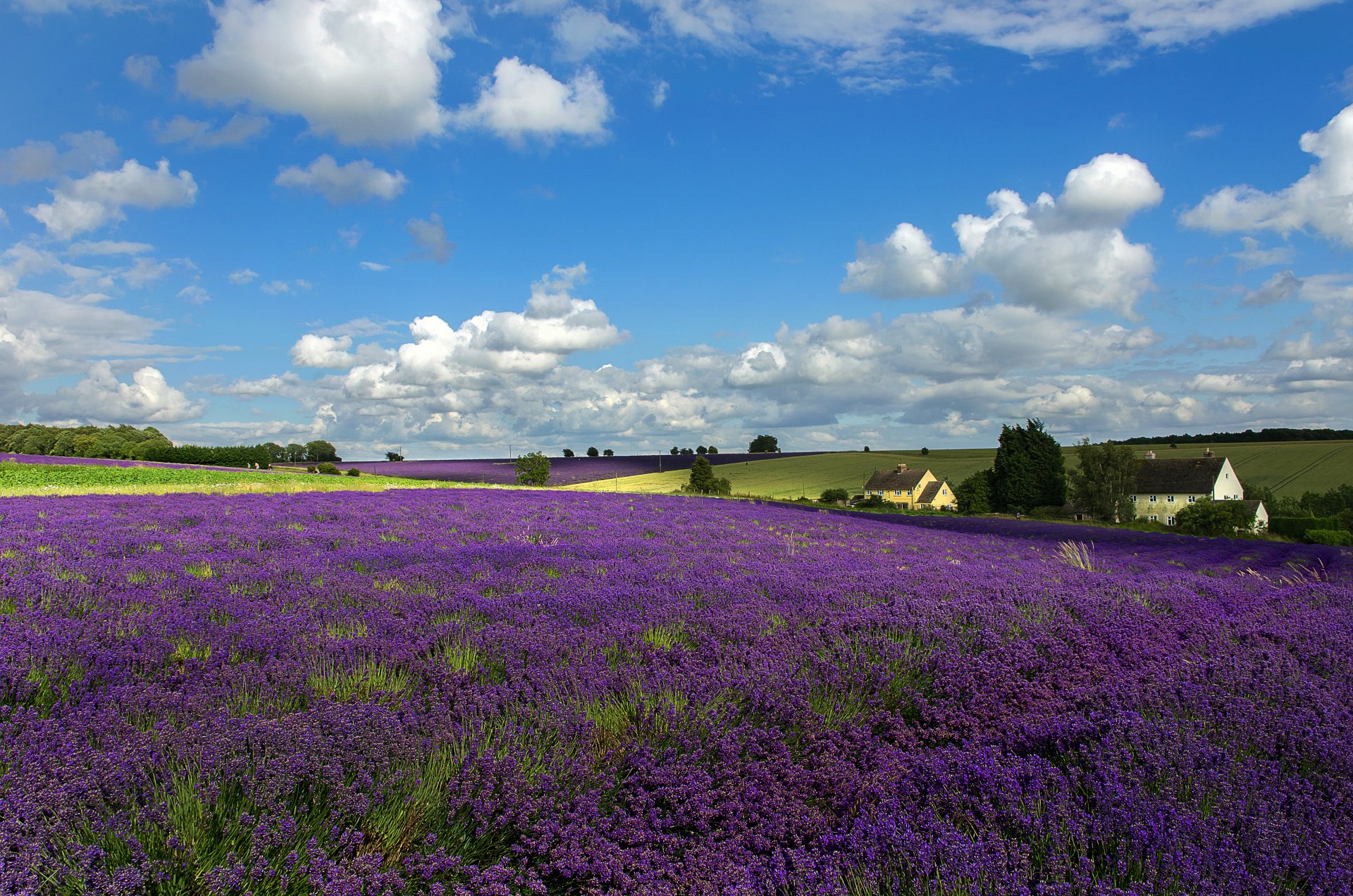 Journée sur un champ de lavande sous un ciel bleu avec des nuages blancsJournée sur un champ de lavande sous un ciel bleu avec des nuages blancs