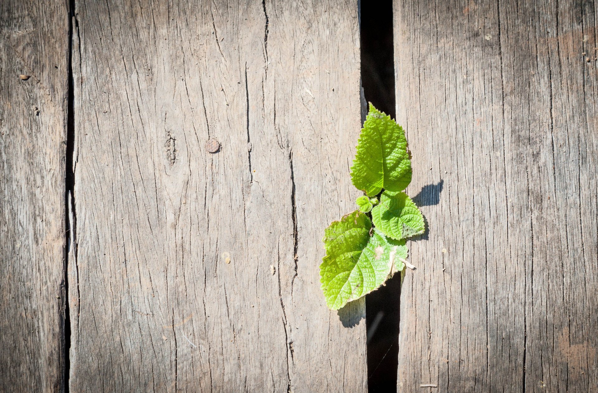 Brindille avec des feuilles se fraye un chemin à travers les planches de boisBrindille avec des feuilles se fraye un chemin à travers les planches de bois
