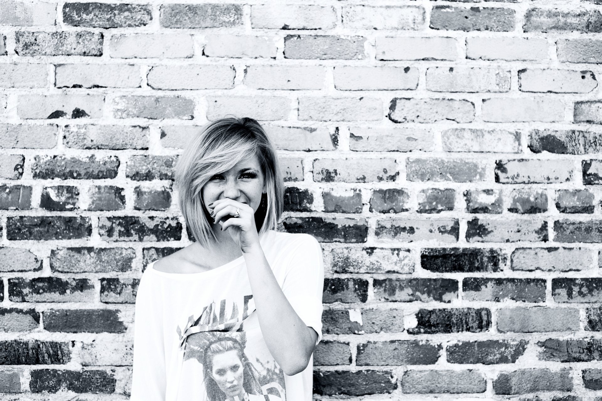 Fille riant sur fond de mur de briques